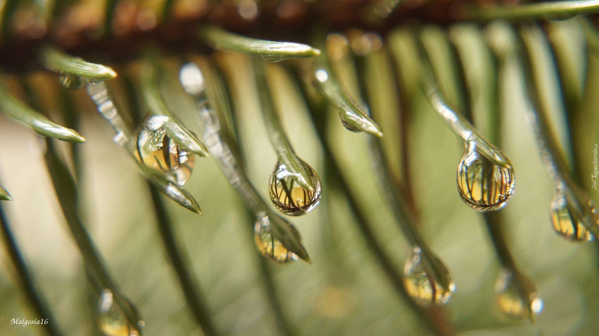 Edytor tapety: Krople wody na igiełkach świerkowych