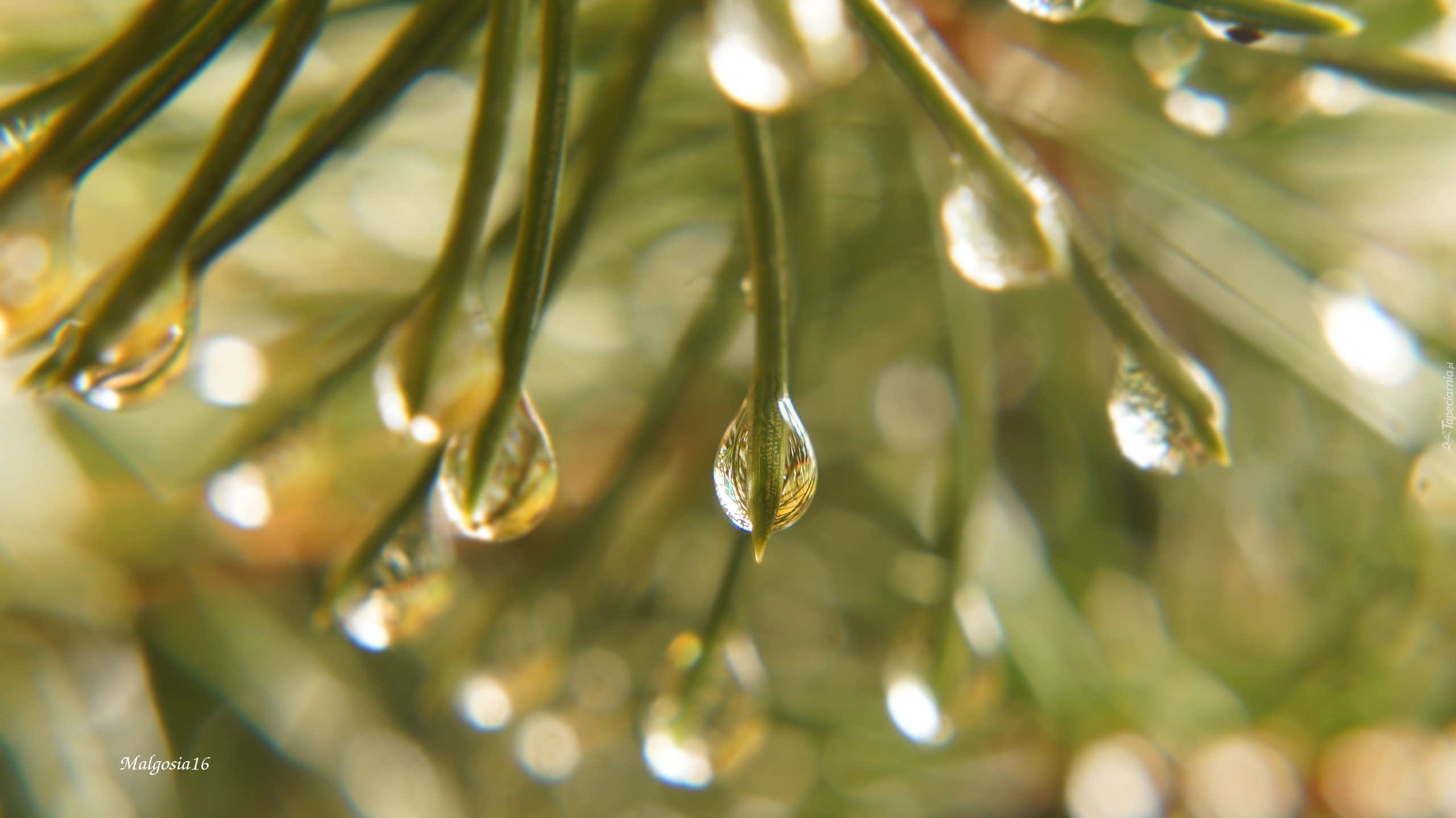 Edytor tapety: Krople wody na igłach świerku z bliska