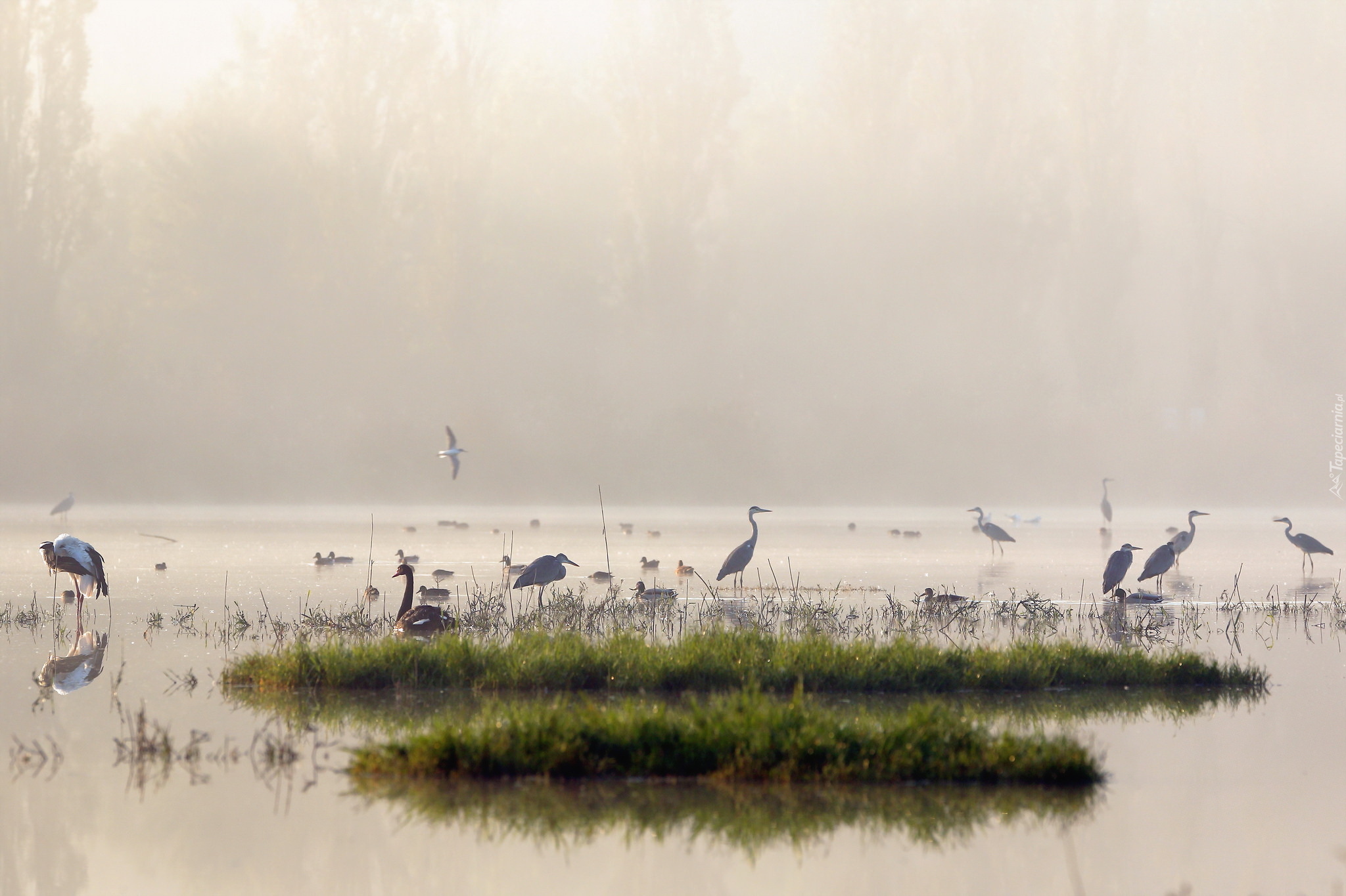 Edytor tapety: Czaple i kaczki na zamglonym jeziorze