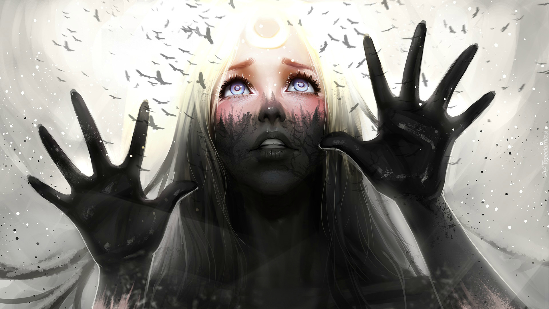 Edytor tapety: Dziewczyna przez szybę ogląda ptaki w grafice 2D