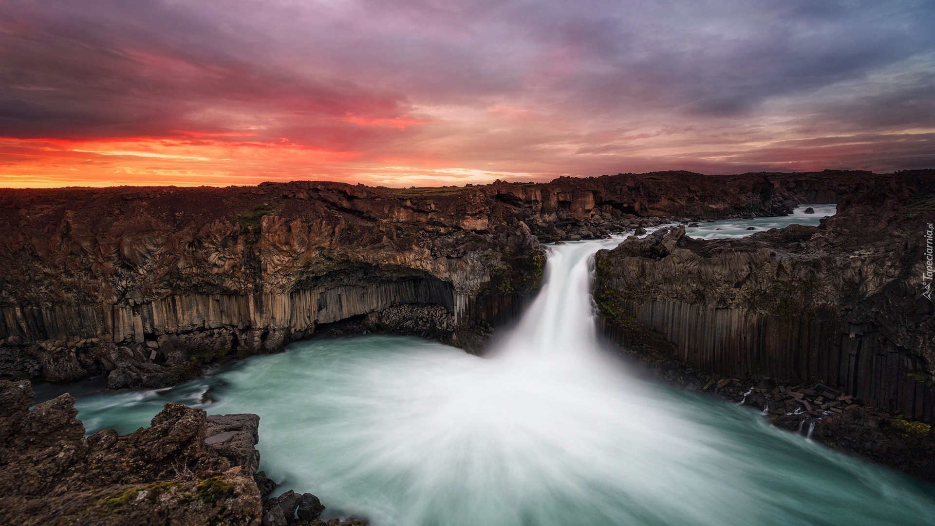 Edytor tapety: Wodospad Aldeyjarfoss między bazaltowymi skałami w Islandii