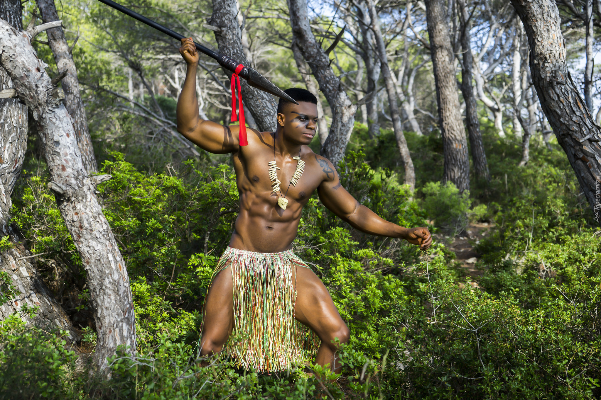Edytor tapety: Mężczyzna upozowany na afrykańskiego wojownika z dzidą
