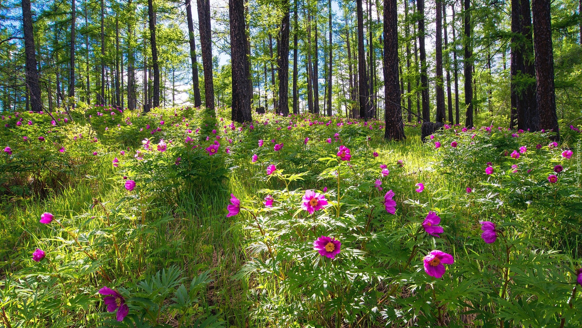Edytor tapety: Piwonie zakwitły na leśnej polanie