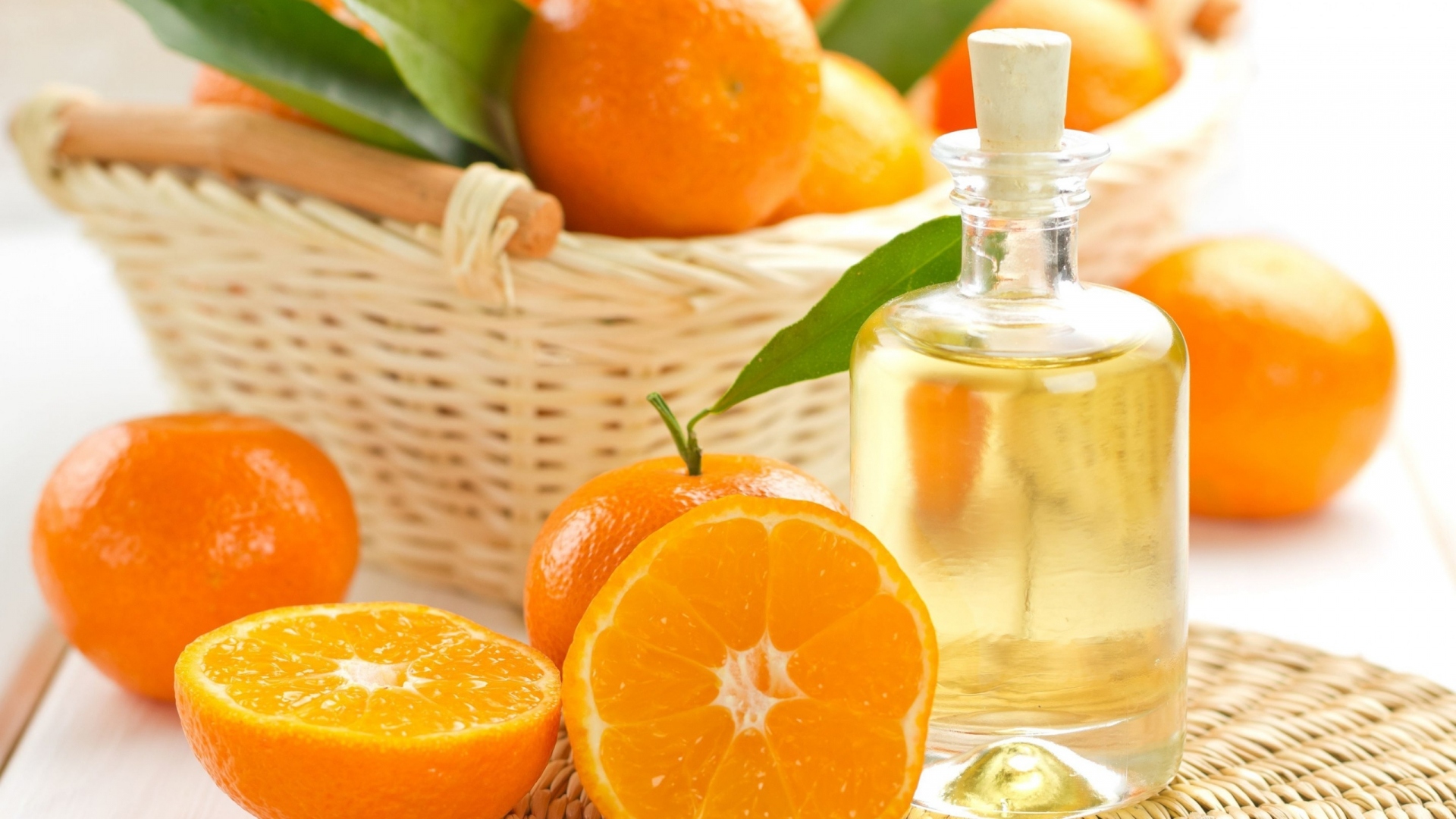 Edytor tapety: Butelka olejku pomarańczowego i owoce pomarańczy