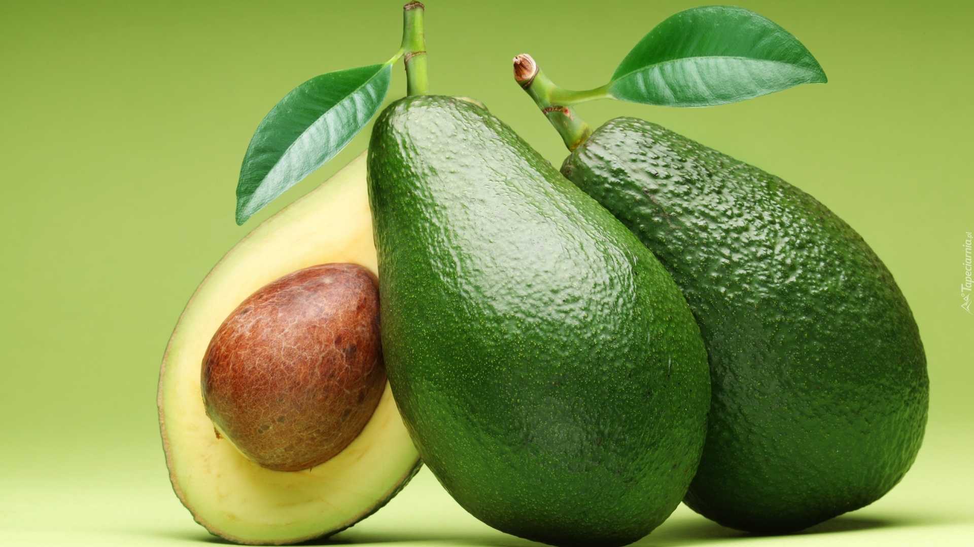 Edytor tapety: Całe owoce avokado i połówka z widoczną pestką