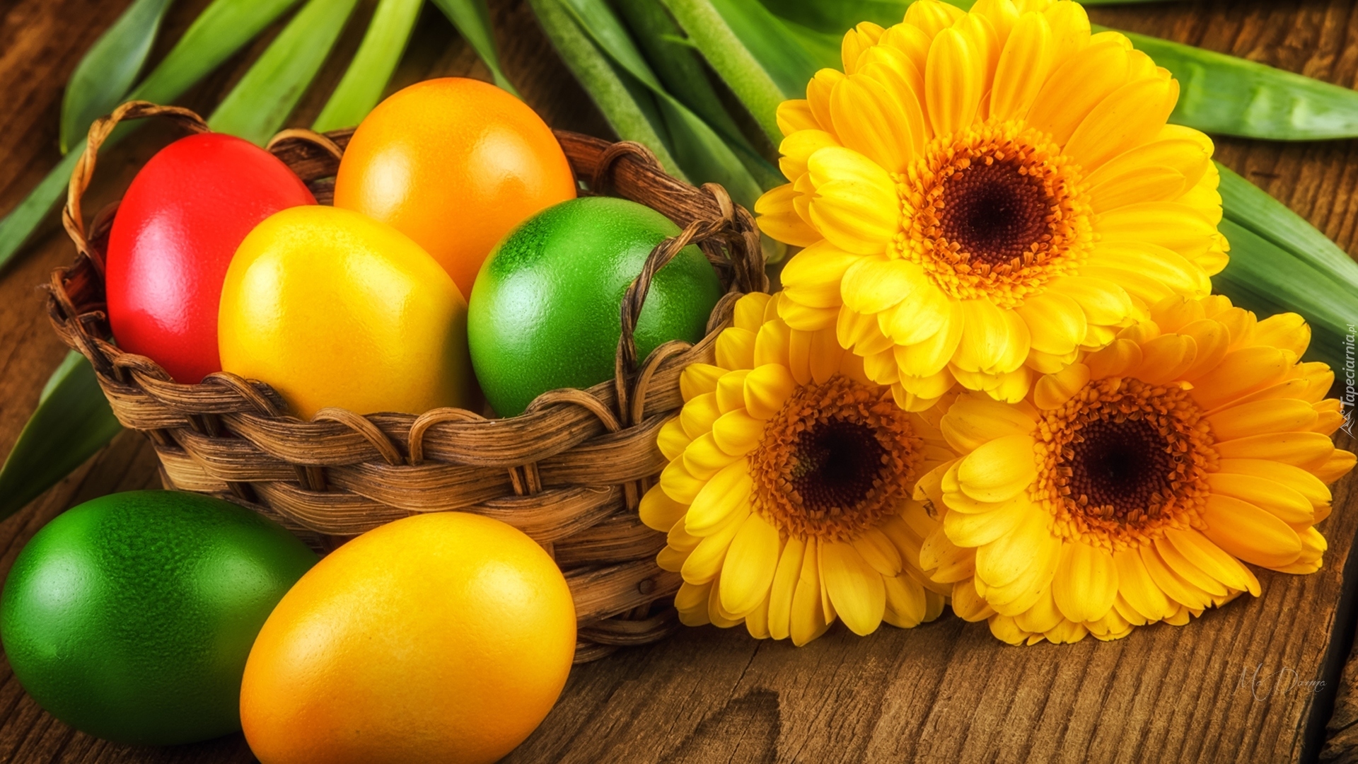 Edytor tapety: Żółte gerbery ułożone obok koszyczka z pisankami