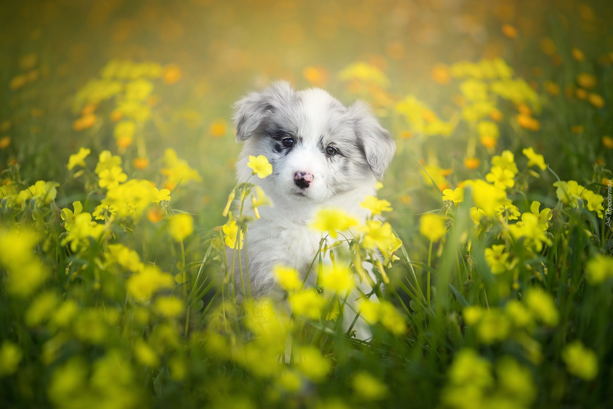 Edytor tapety: Szczeniaczek border collie na ukwieconej łące