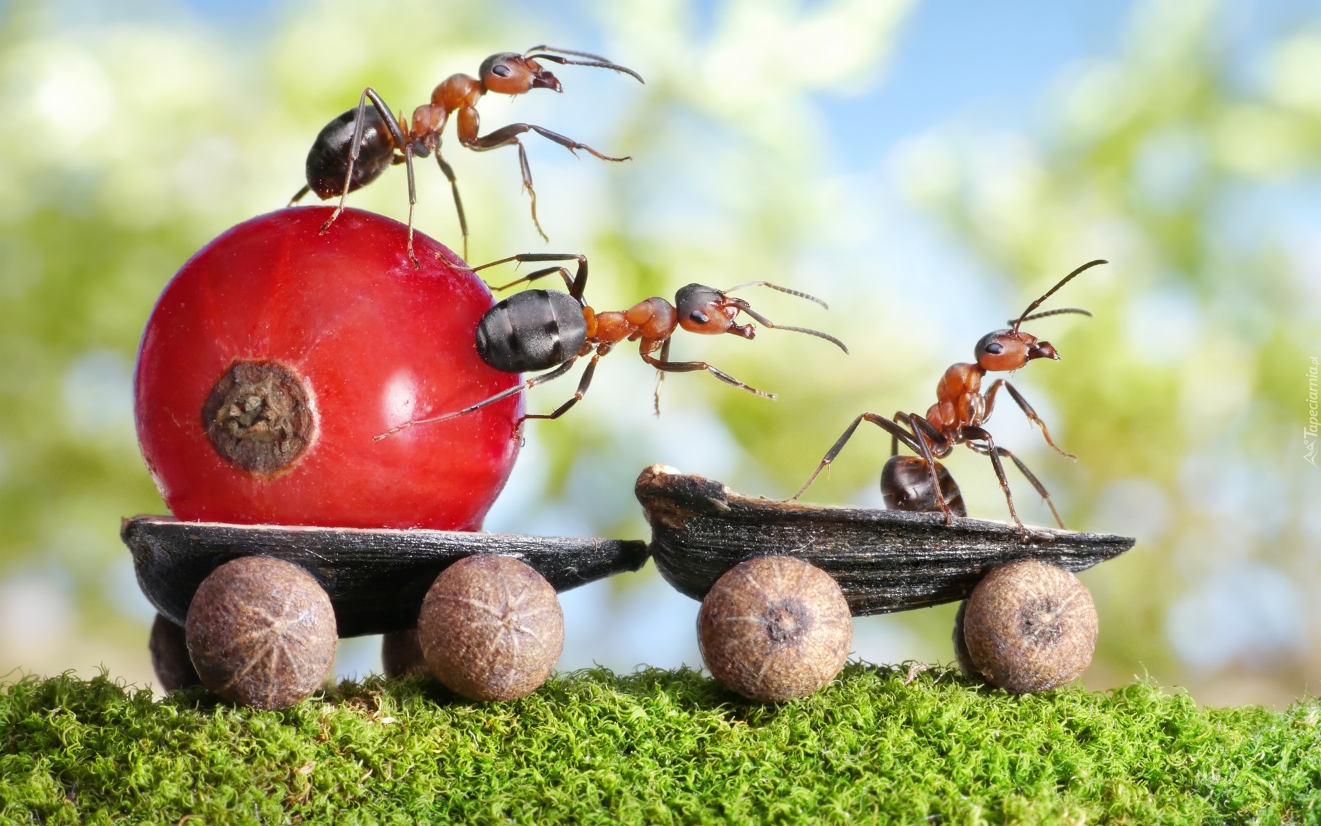 Edytor tapety: Pracowite mrówki na wózku podczas transportu porzeczki