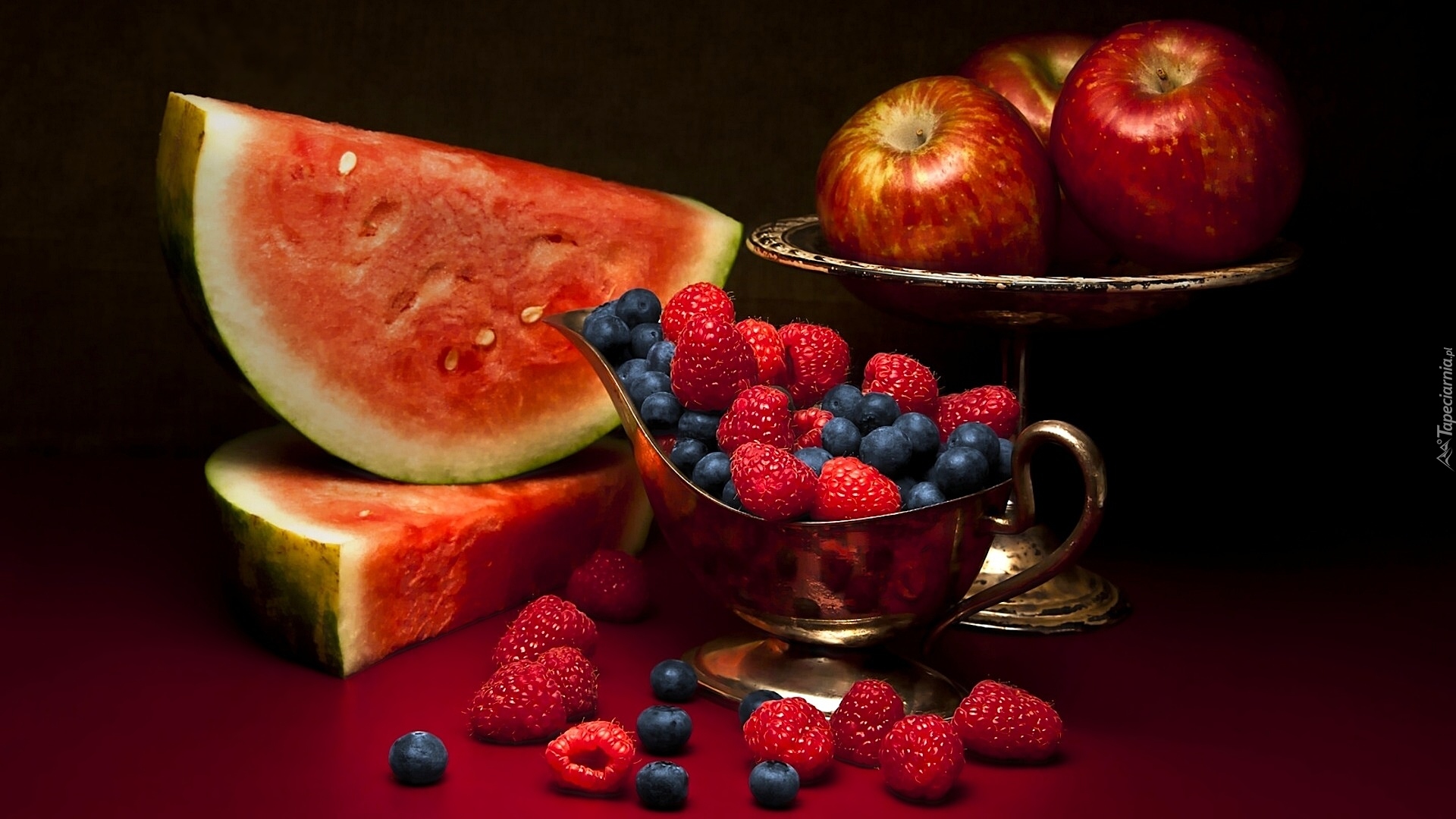 Edytor tapety: Owocowa kompozycja z malinami, borówkami, arbuzem i jabłkami