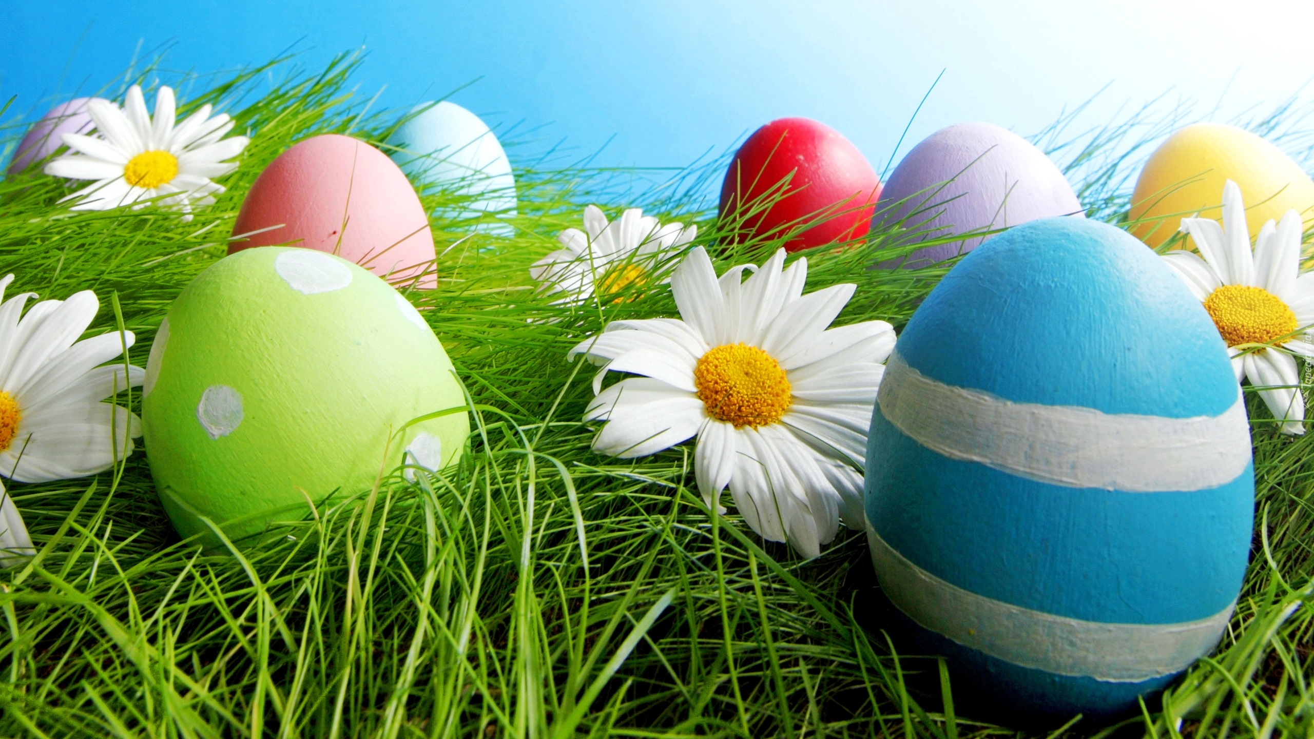 Edytor tapety: Kolorowe pisanki i margerytki w trawie