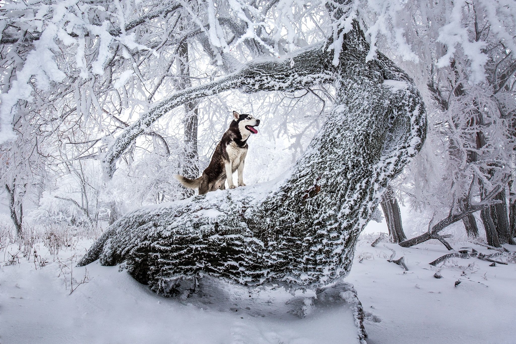 Edytor tapety: Siberian husky na pniu drzewa w zaśnieżonym lesie