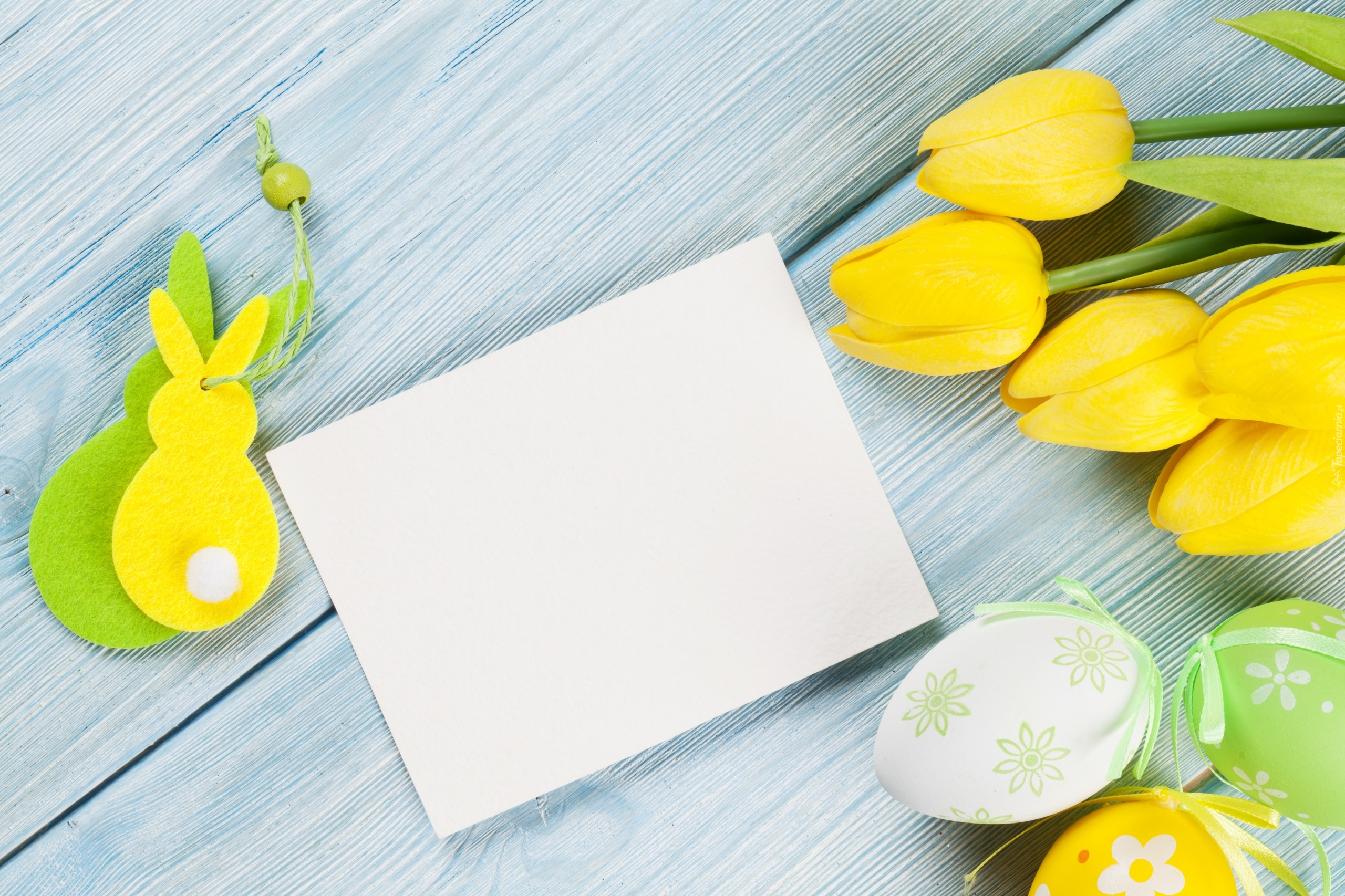 Edytor tapety: Wielkanocna kompozycja z tulipanów, pisanek i króliczków-zawieszek