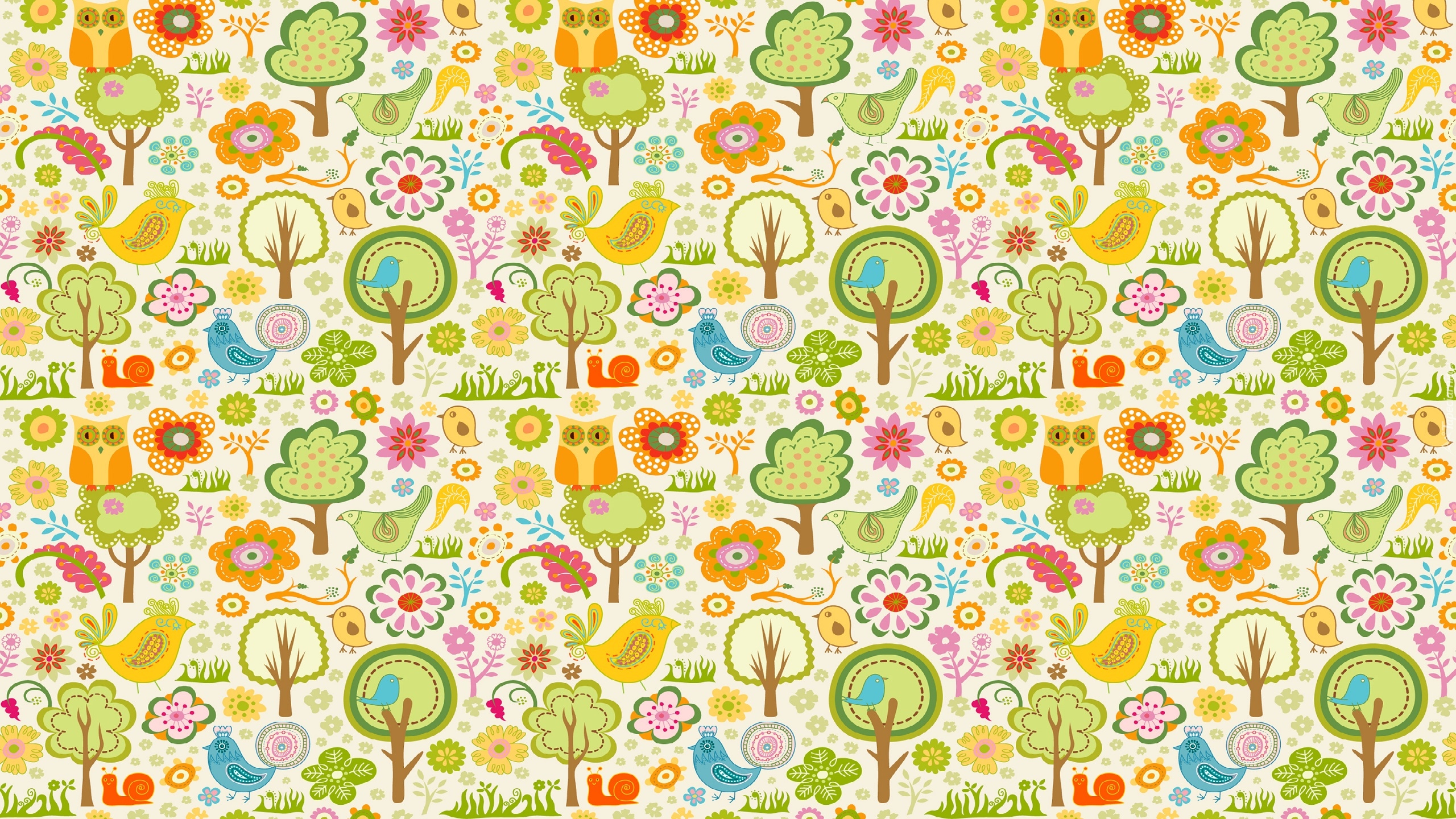 Edytor tapety: Tekstura z kolorowymi drzewami, ptaszkami i kwiatami