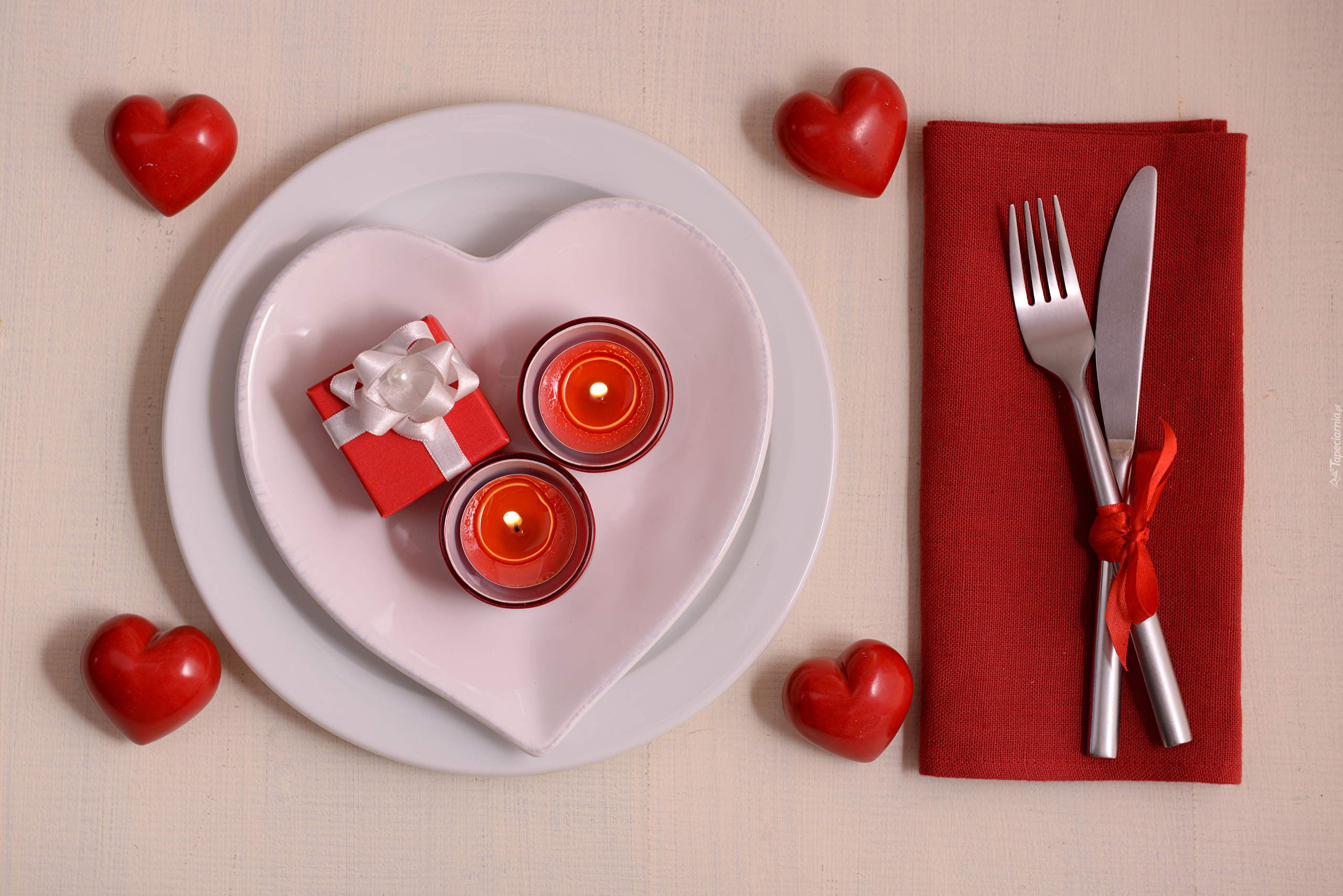 Edytor tapety: Walentynkowe nakrycie z serduszkami i prezentem na talerzu