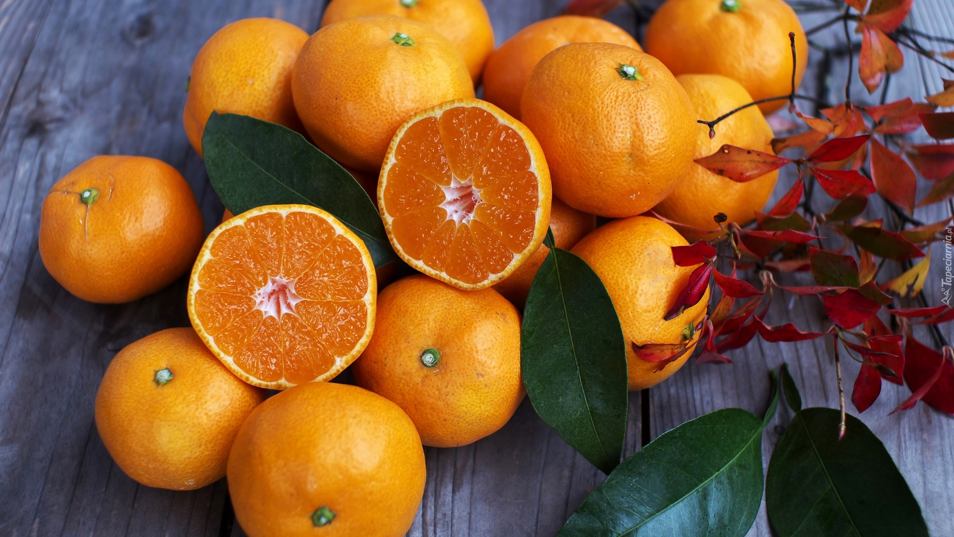 Edytor tapety: Pomarańcze ułożone na drewnianym blacie wśród liści