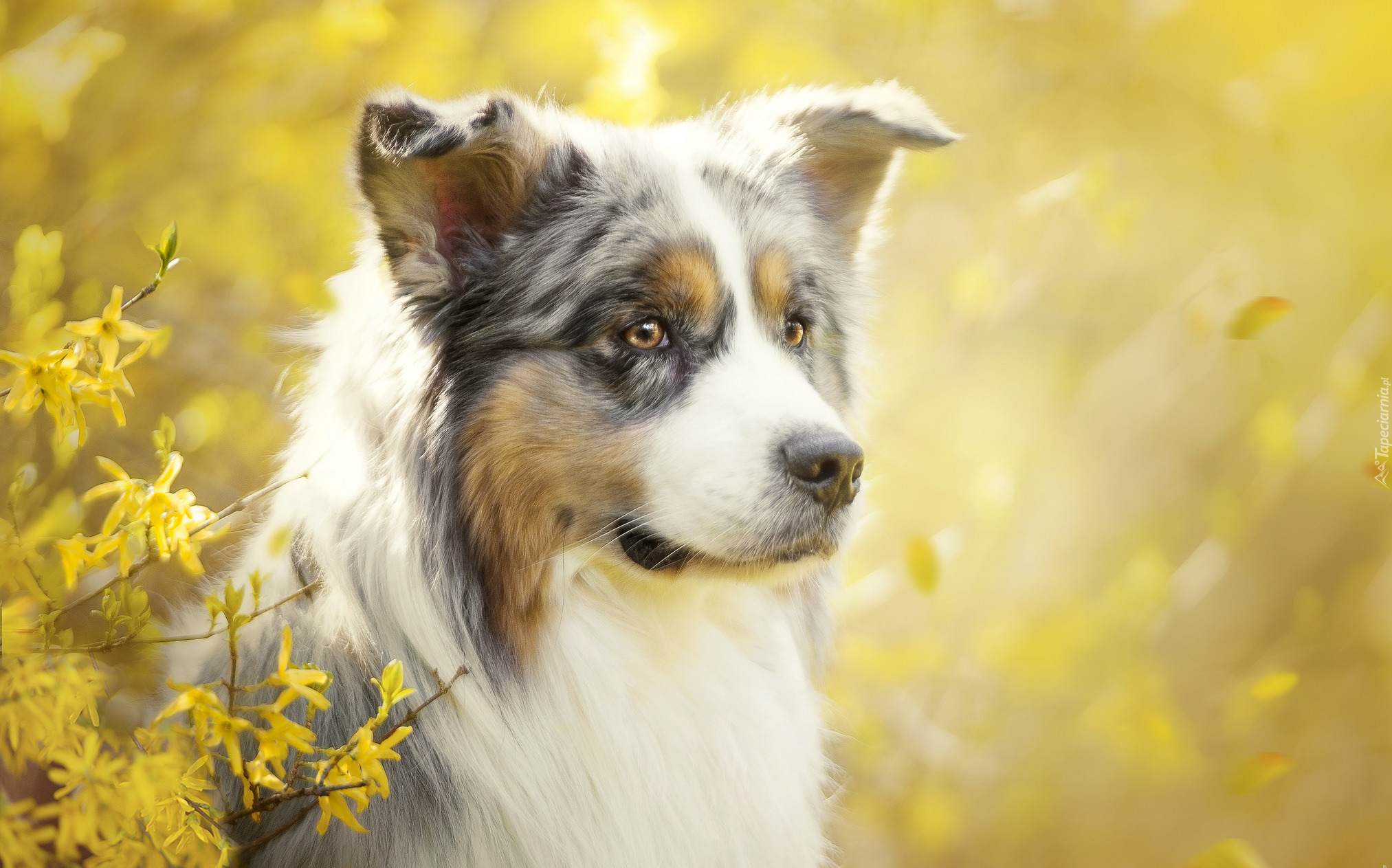 Edytor tapety: Portret owczarka australijskiego przy kwitnącej forsycji