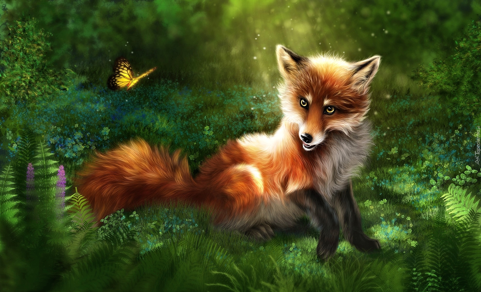 Edytor tapety: Rudy lis obserwuje fruwającego motyla w grafice 2D