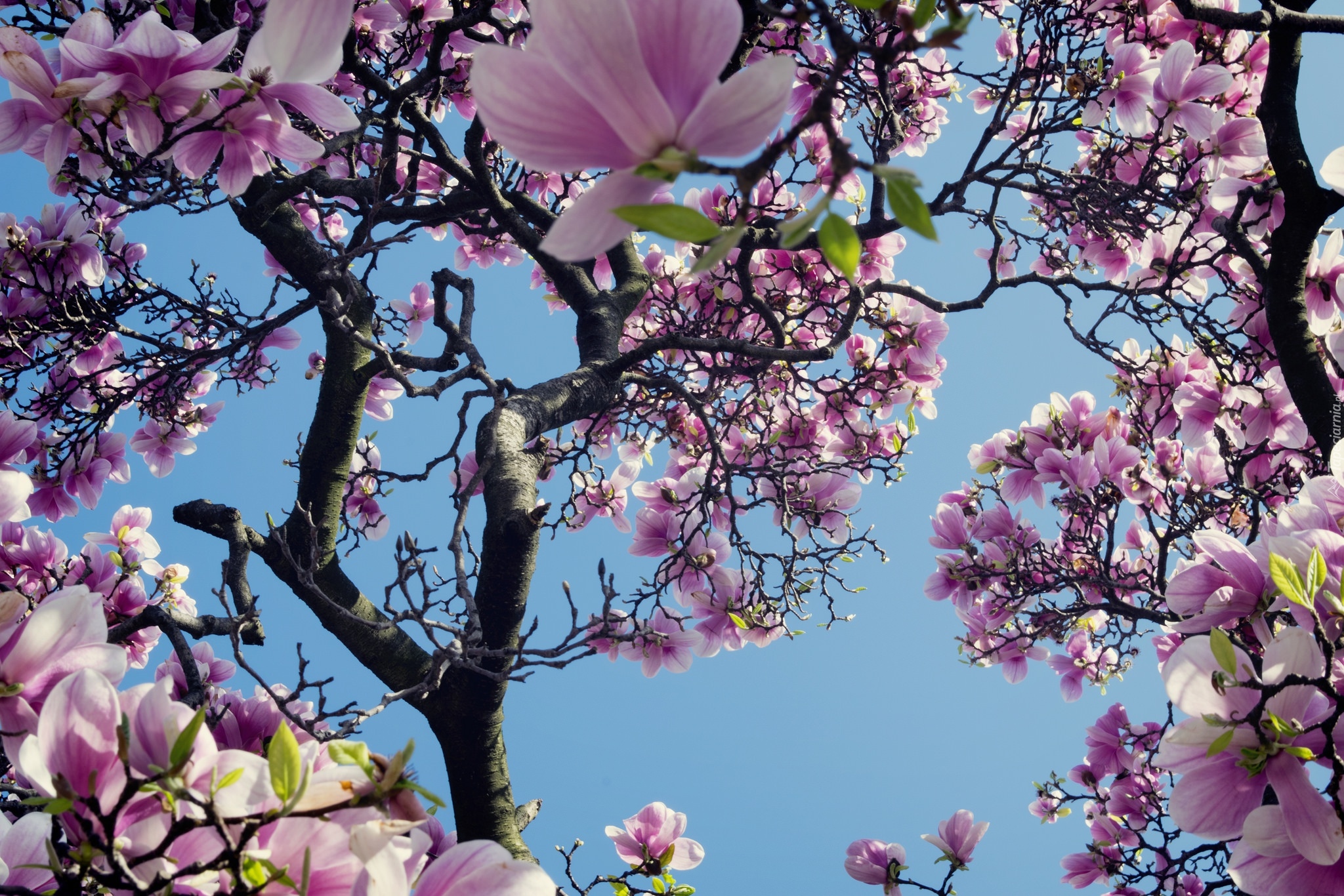 Edytor tapety: Kwiaty magnolii na tle nieba oświetlone słońcem