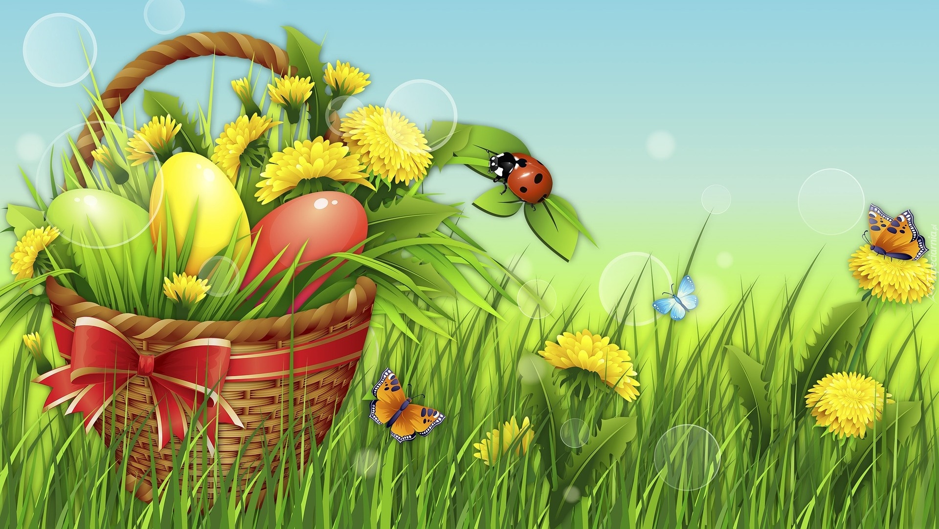 Edytor tapety: Wielkanocna grafika z koszem pisanek na trawie