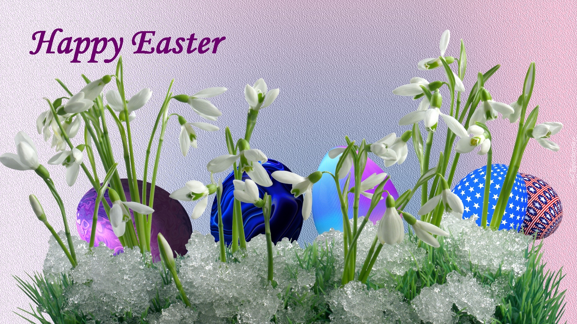 Edytor tapety: Pisanki między przebiśniegami w śniegu i życzenia wielkanocne