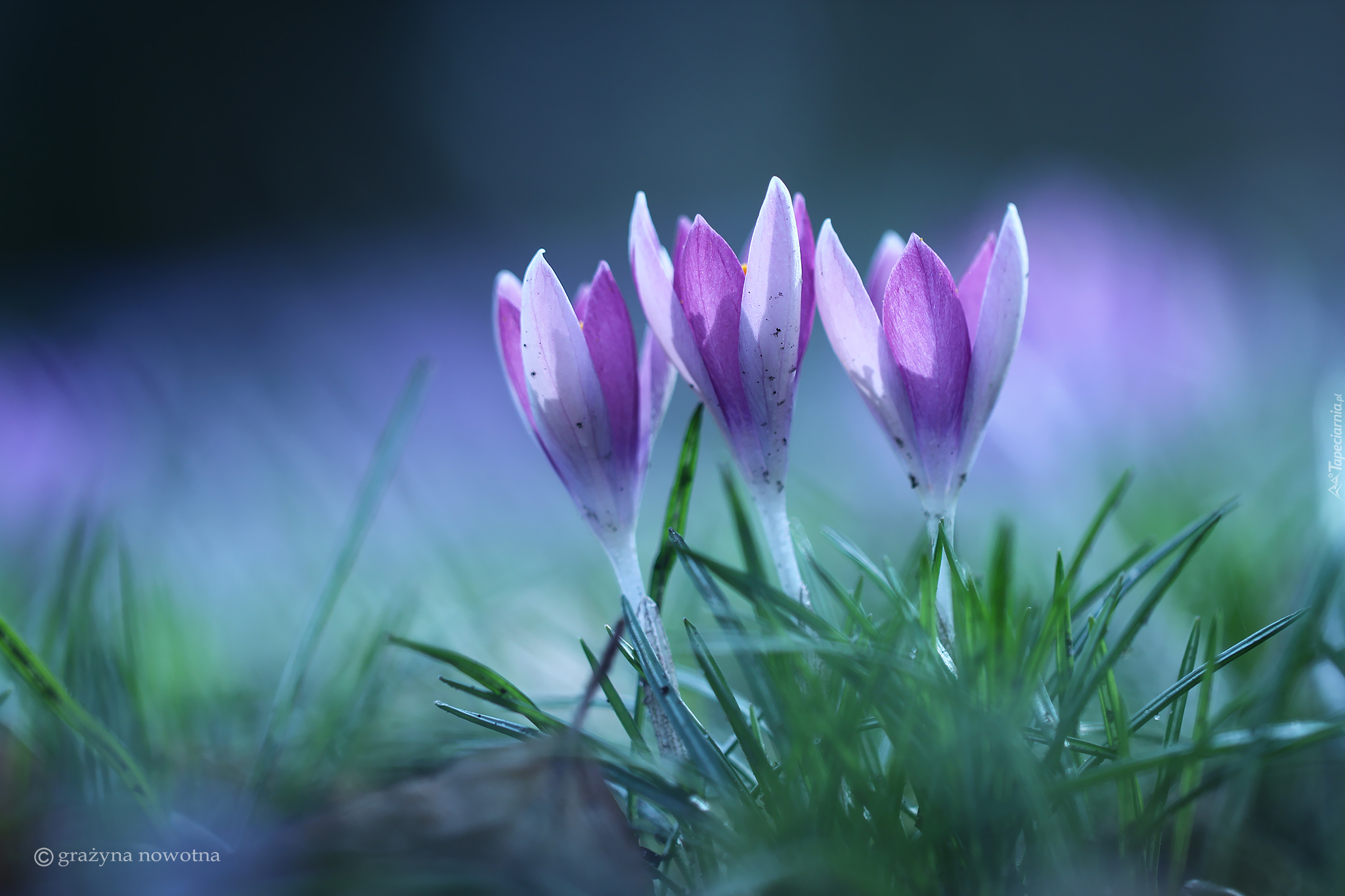 Edytor tapety: Liliowo-fioletowe krokusy rozświetlone blaskiem słońca