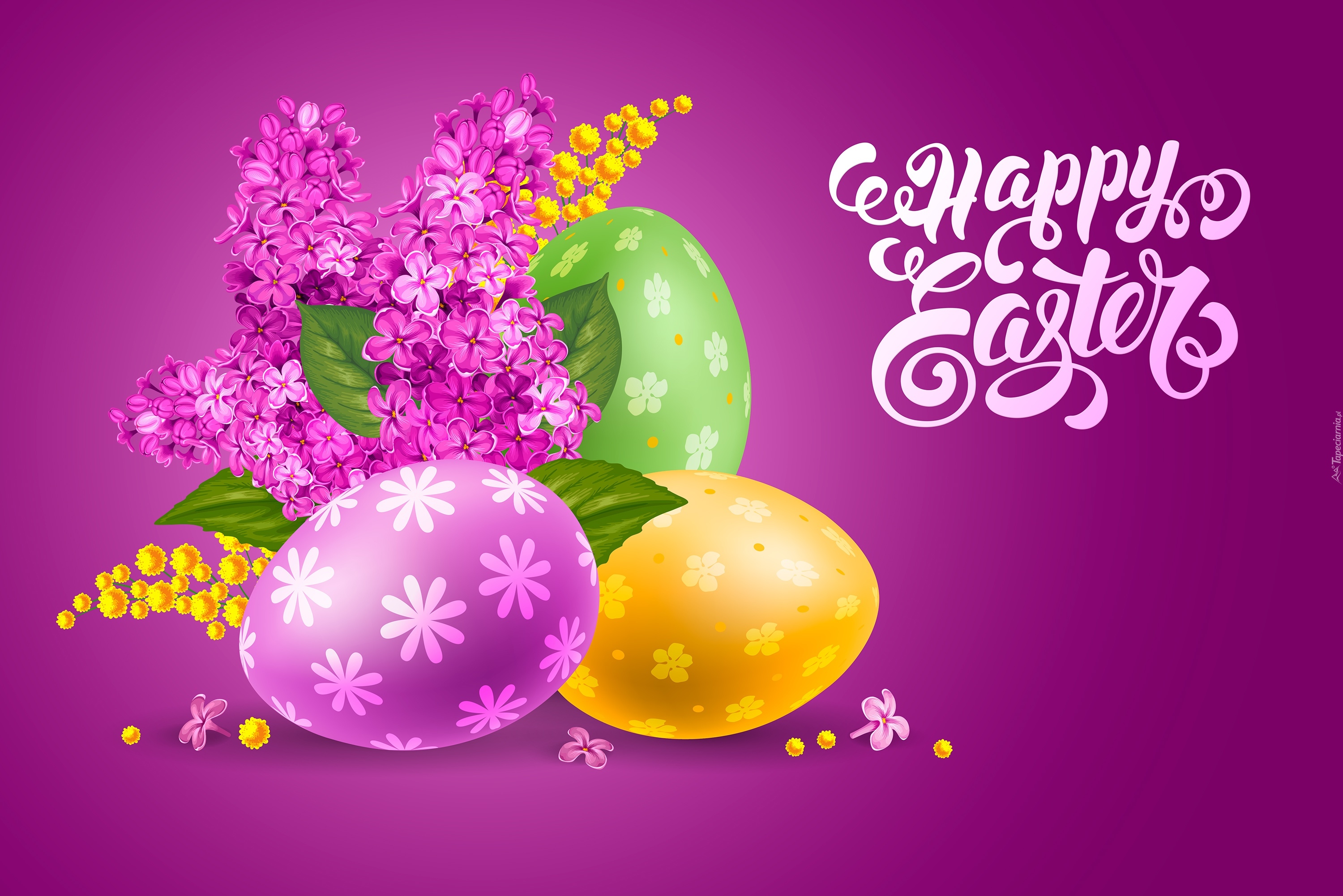 Edytor tapety: Wielkanocna grafika 2D z pisankami, bzem i życzeniami