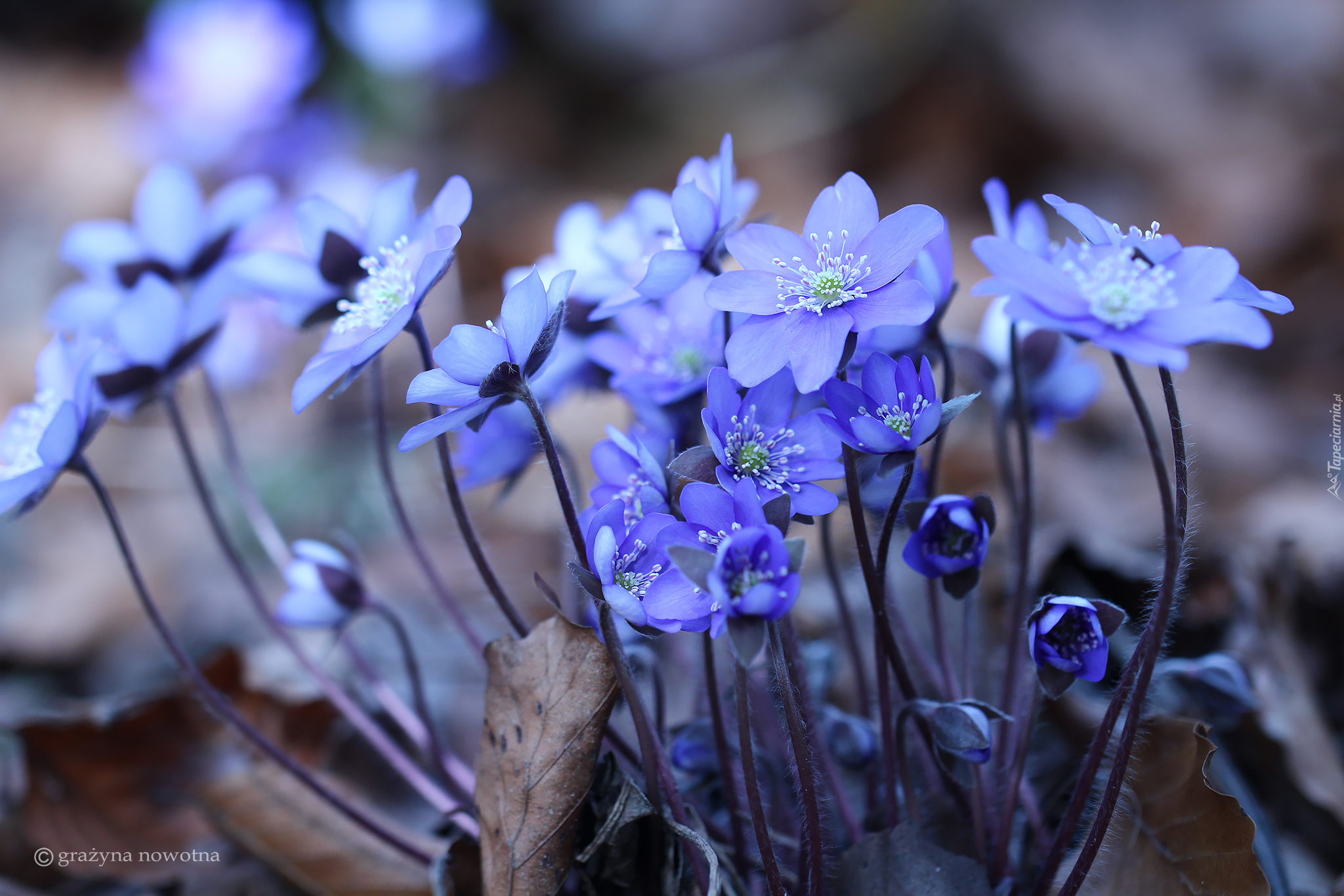 Edytor tapety: Niebieskie przylaszczki wśród suchych liści