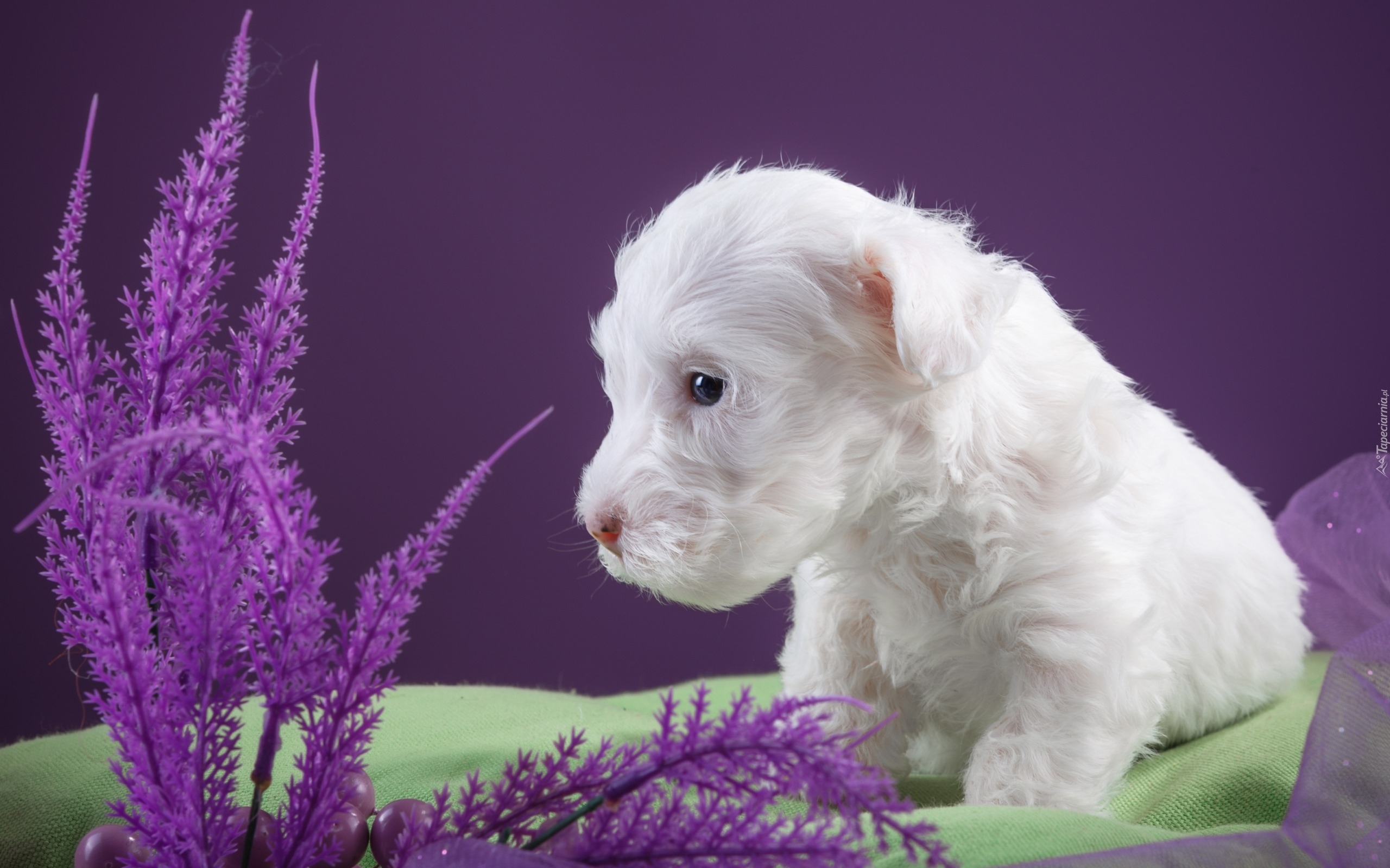Edytor tapety: Biały szczeniak przy fioletowej roślince