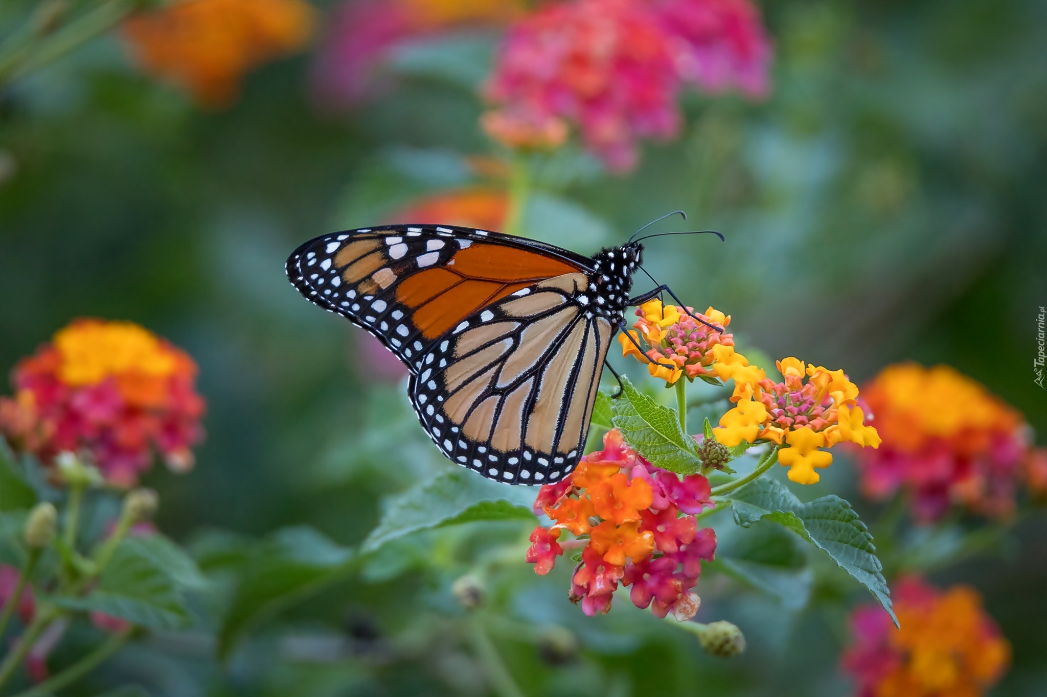 Edytor tapety: Motyl monarcha przysiadł na kolorowych kwiatach