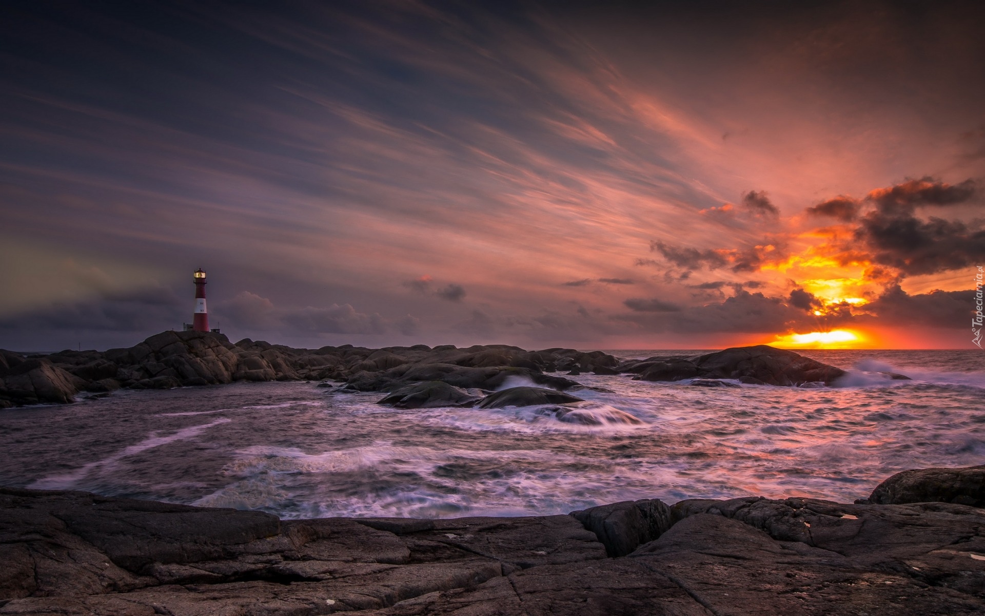 Edytor tapety: Latarnia morska na skałach o zachodzie słońca