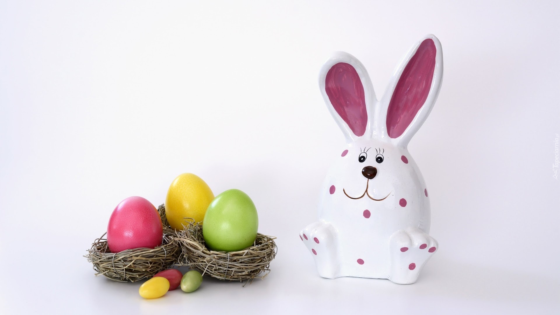 Edytor tapety: Figurka zajączka obok pisanek w gniazdkach