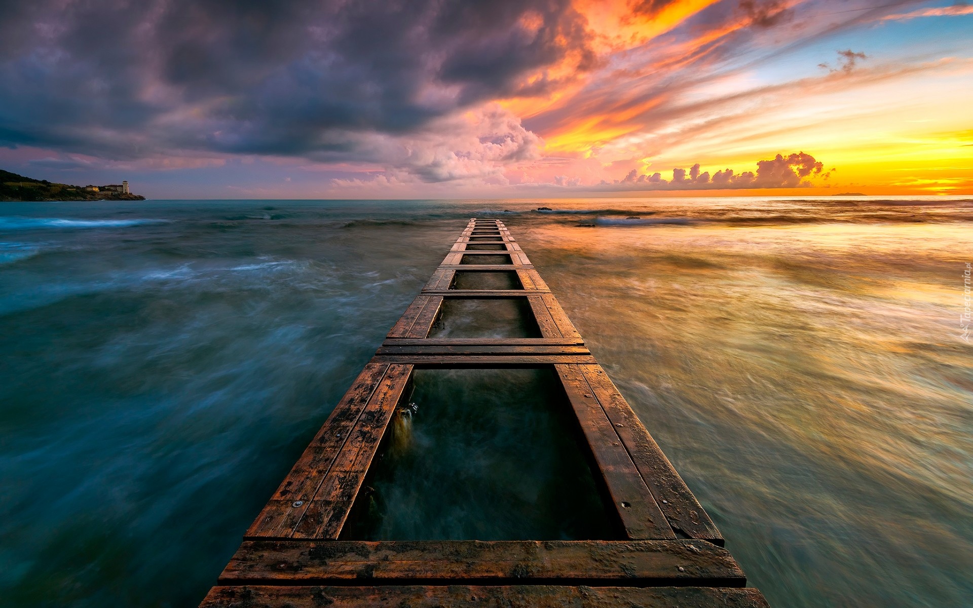 Edytor tapety: Pomost na morzu we włoskiej Toskanii o świcie