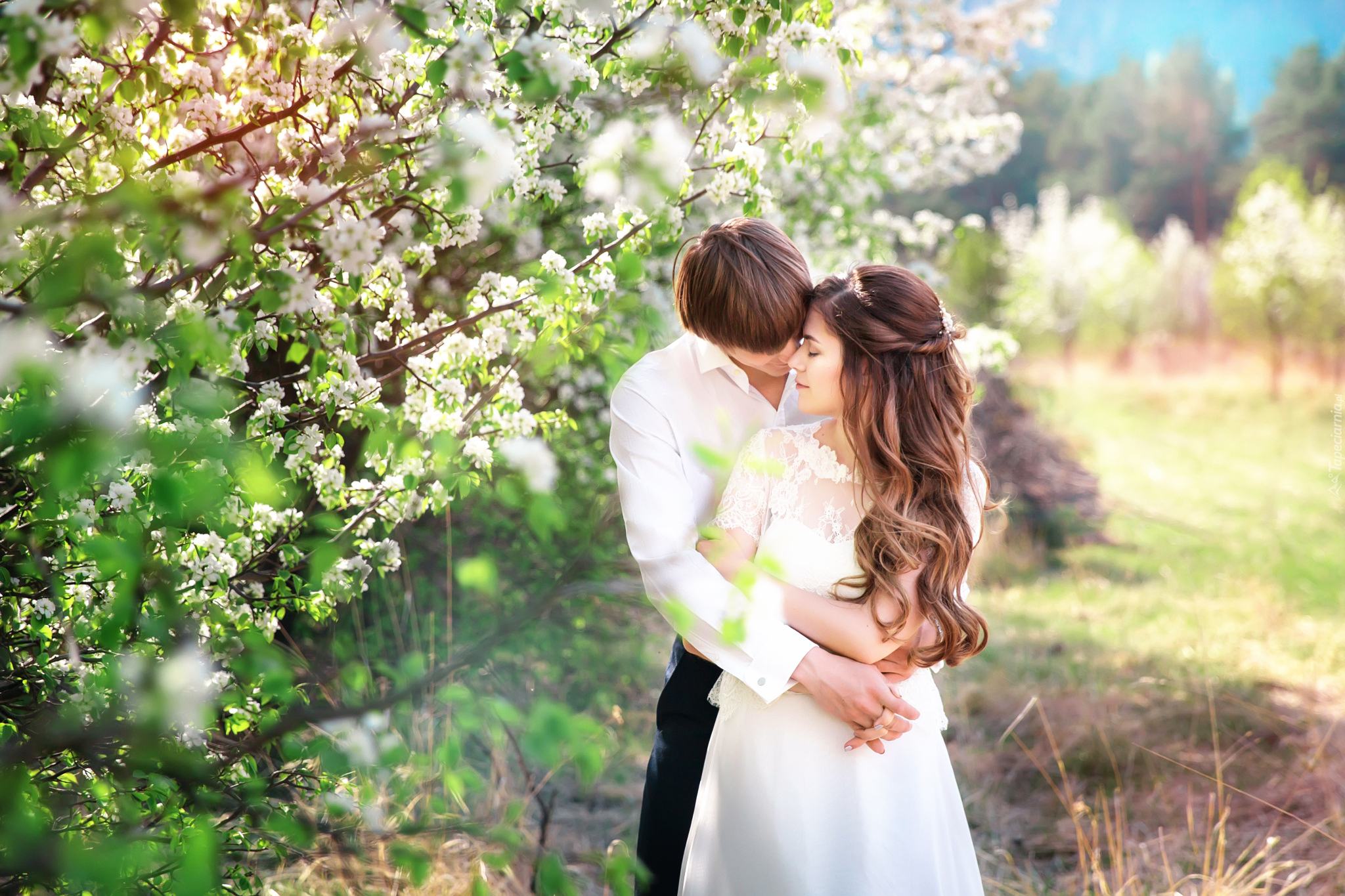 Edytor tapety: Sesja zdjęciowa nowożeńców przy kwitnącym drzewie