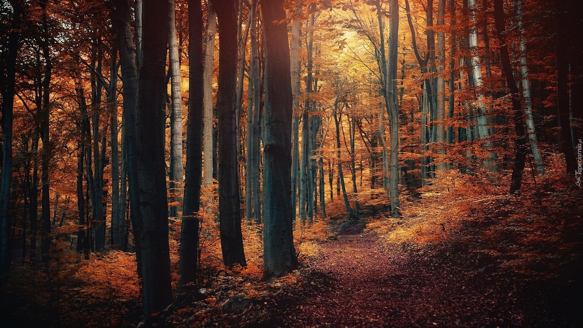Edytor tapety: Ścieżka w jesiennym lesie pokryta liśćmi
