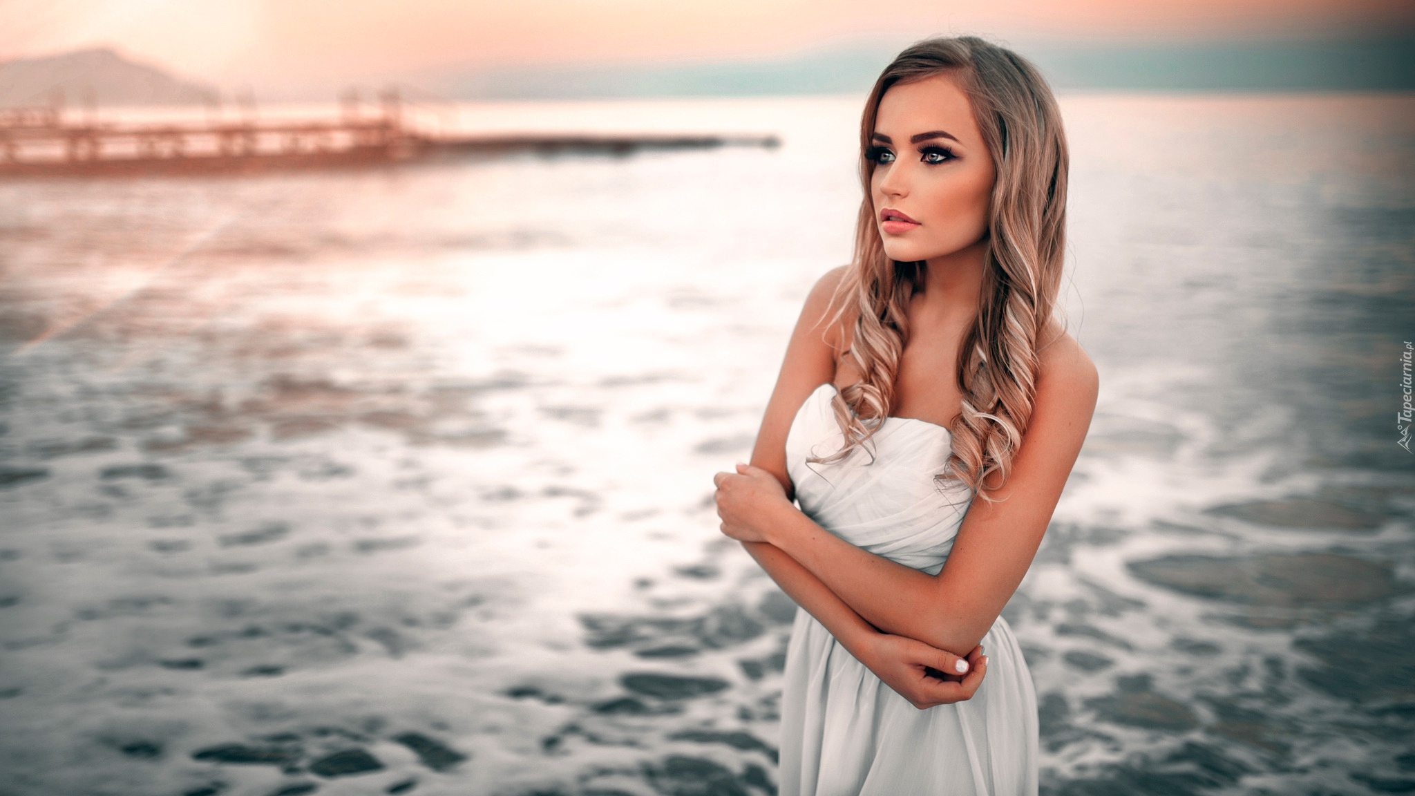 Edytor tapety: Zamyślona kobieta w białej sukience nad morzem