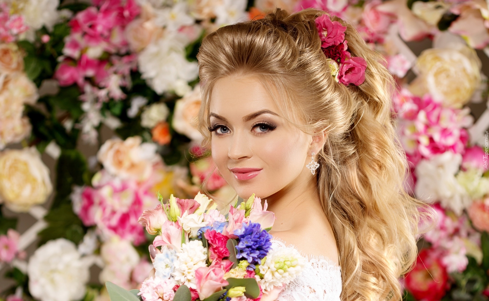 Edytor tapety: Urocza blondynka z bukietem kwiatów