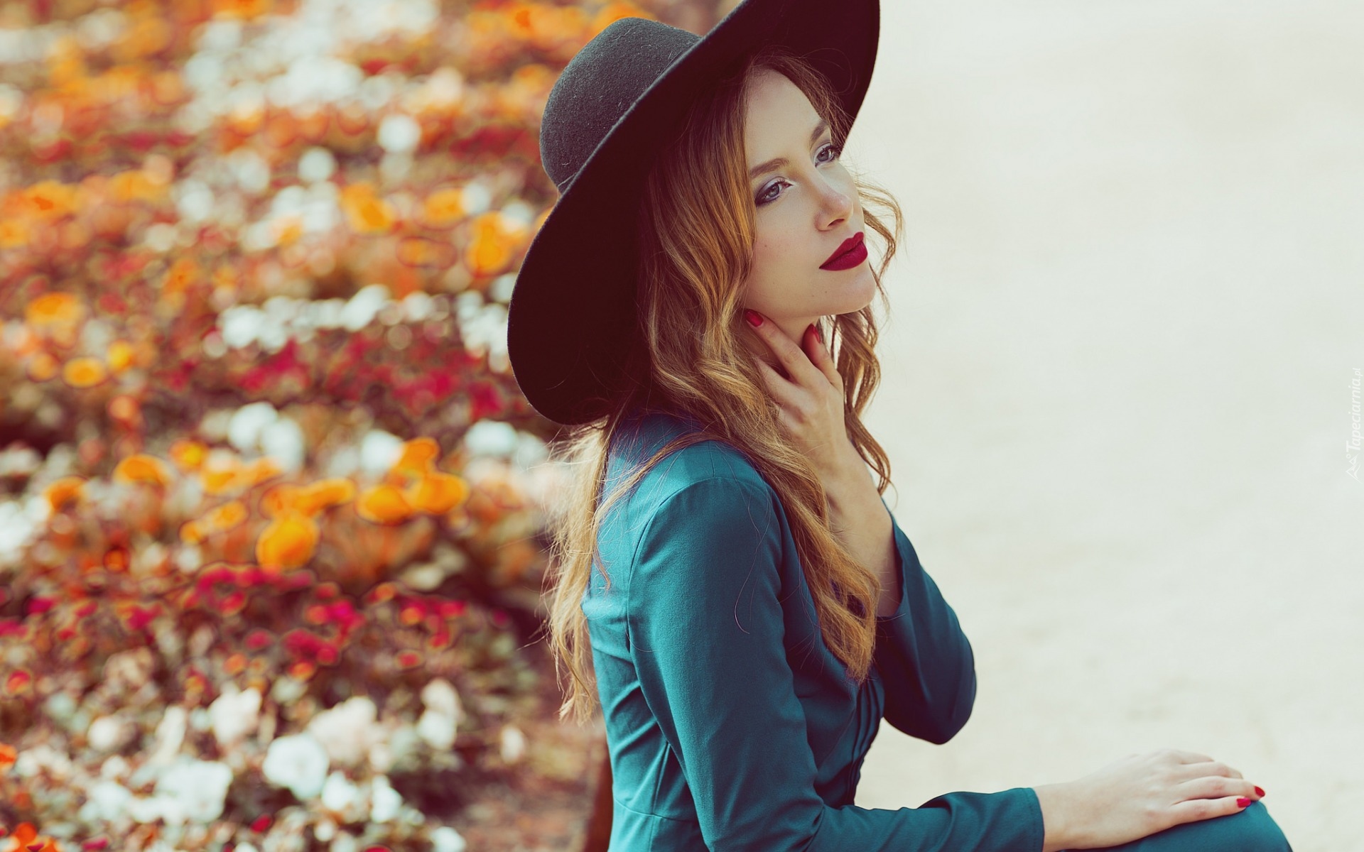 Edytor tapety: Kobieta w ciemnoturkusowej sukni i kapeluszu