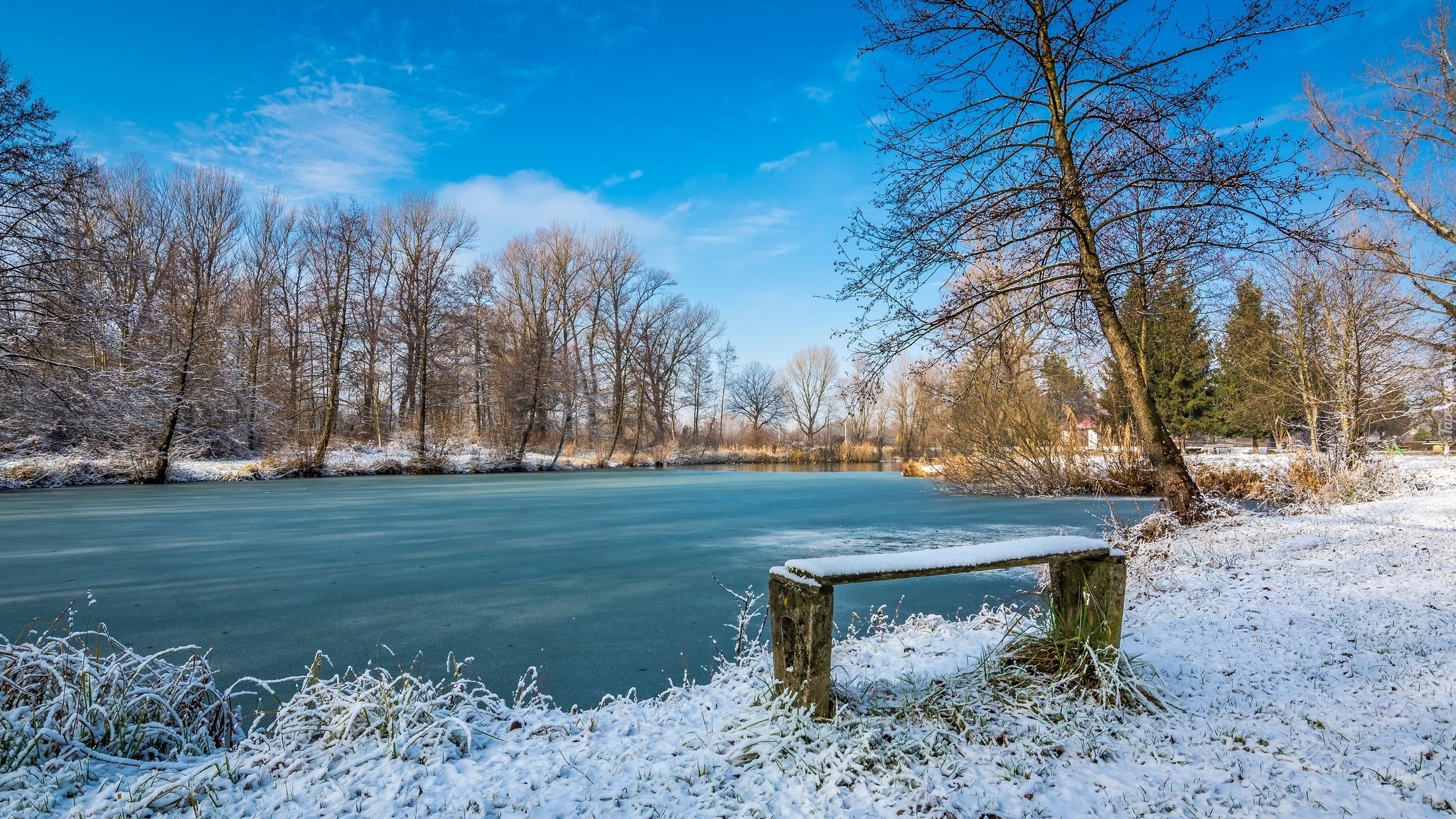 Edytor tapety: Ośnieżona ławeczka nad oblodzoną rzeką wśród drzew