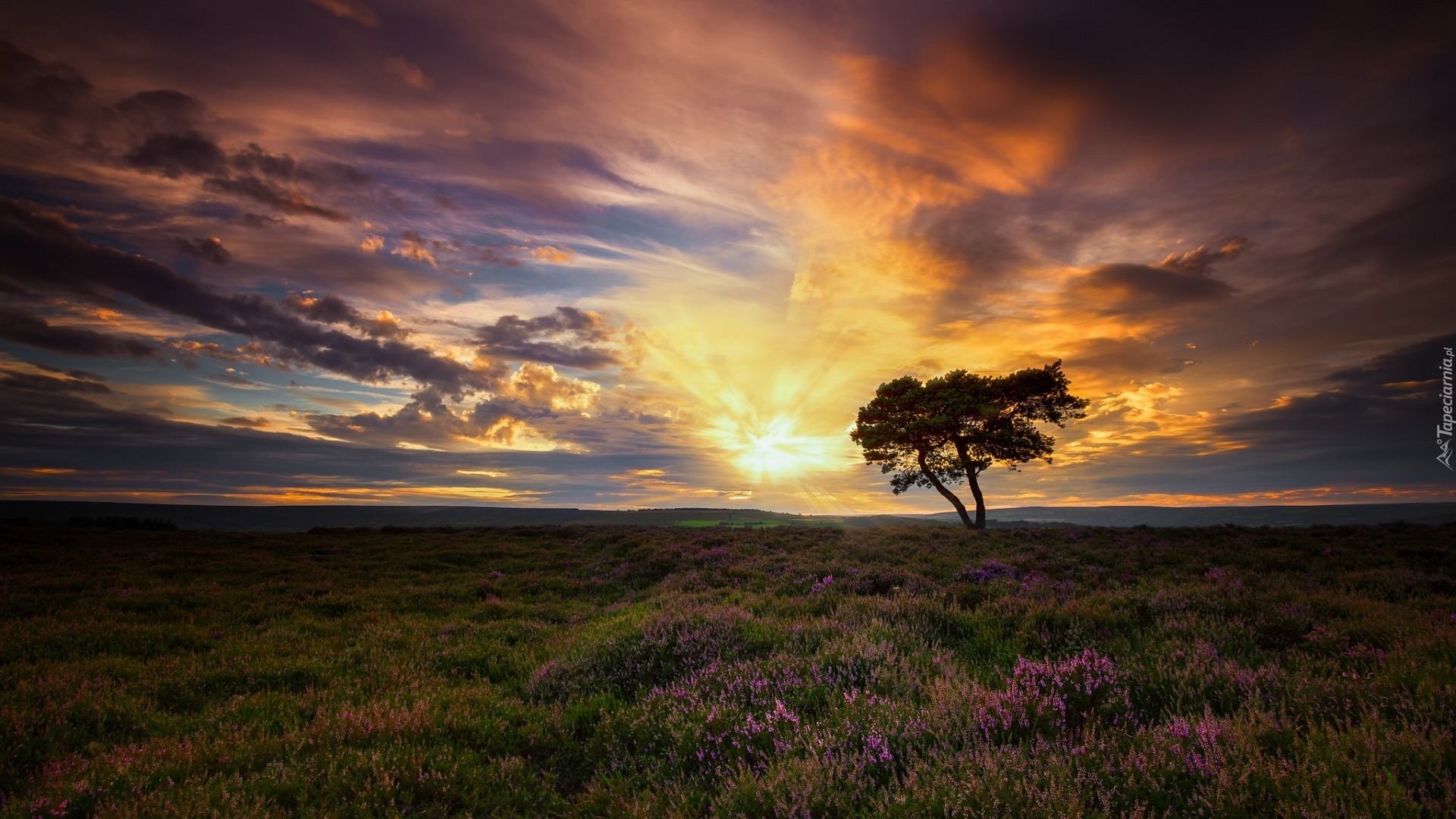 Edytor tapety: Zachód słońca nad samotnym drzewem w angielskim Egton