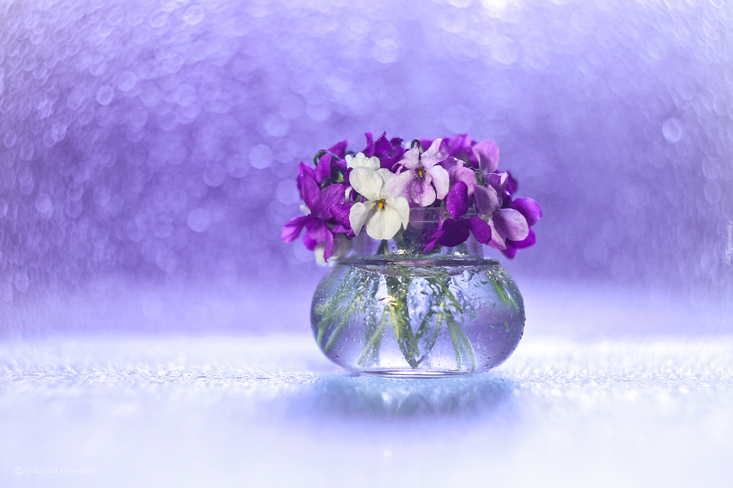 Edytor tapety: Fiołki wonne w szklanym wazoniku na rozmytym tle