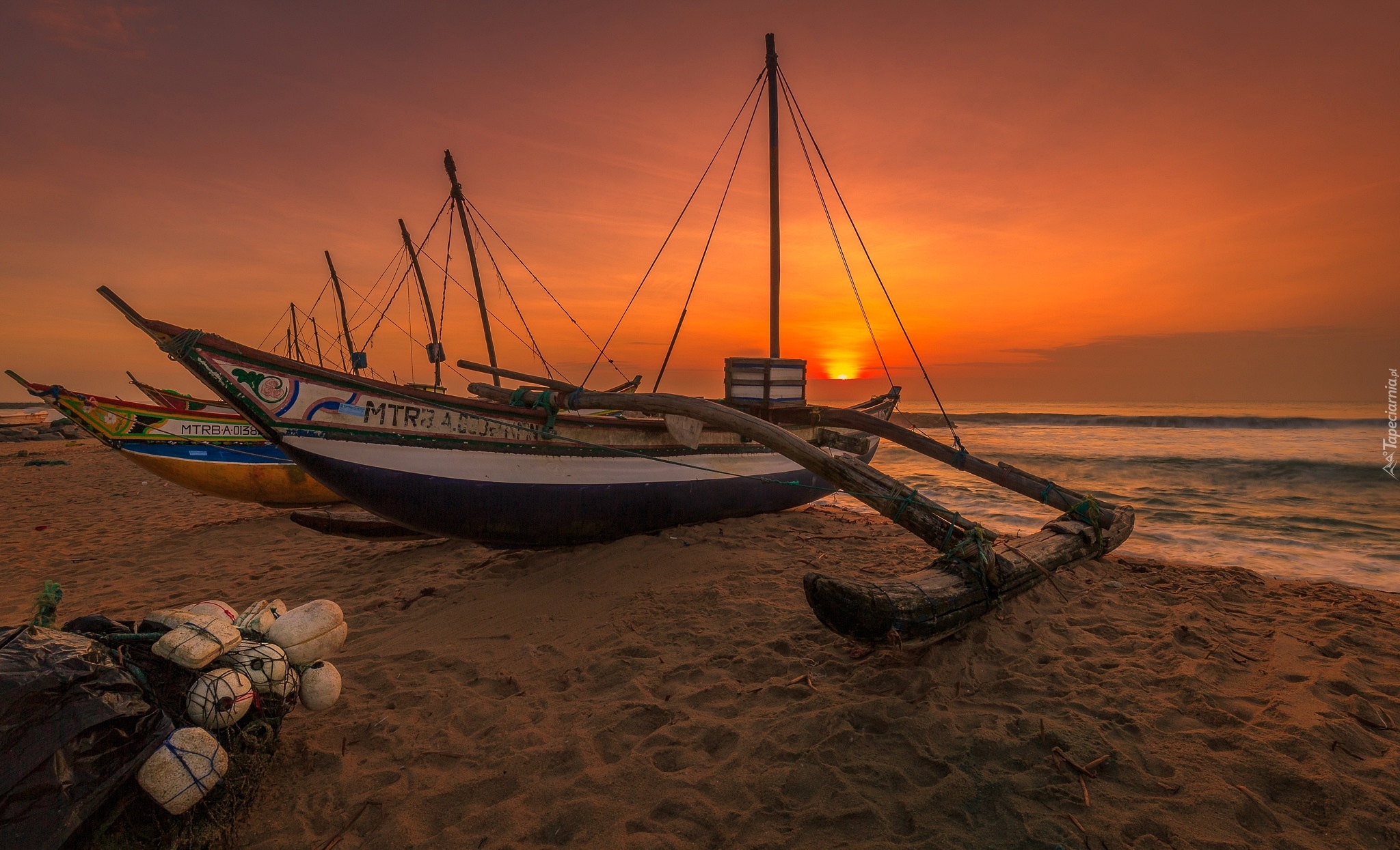 Edytor tapety: Katamarany na plaży w zachodzącym słońcu