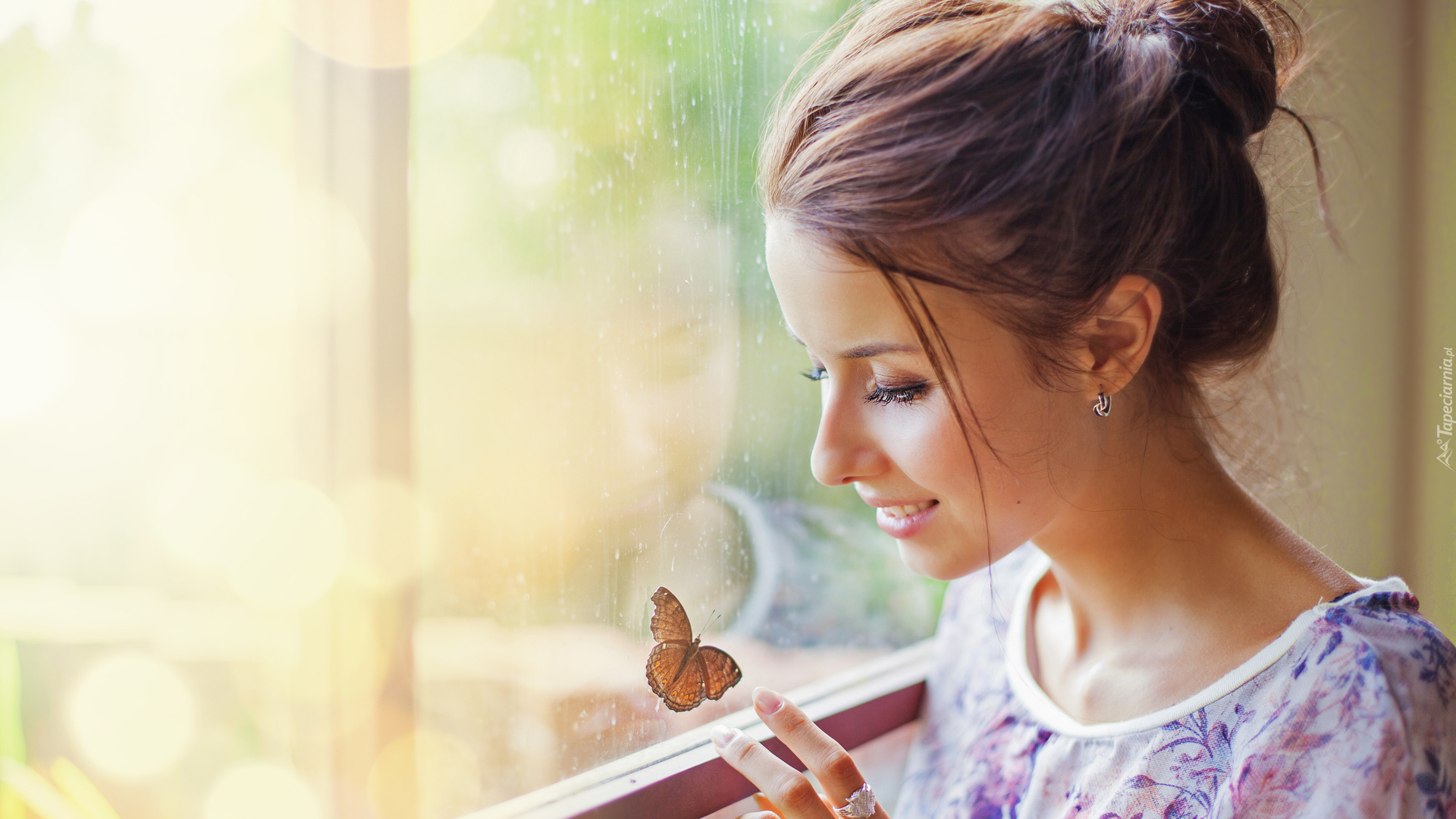 Edytor tapety: Uśmiechnięta kobieta obserwuje motyla na oknie