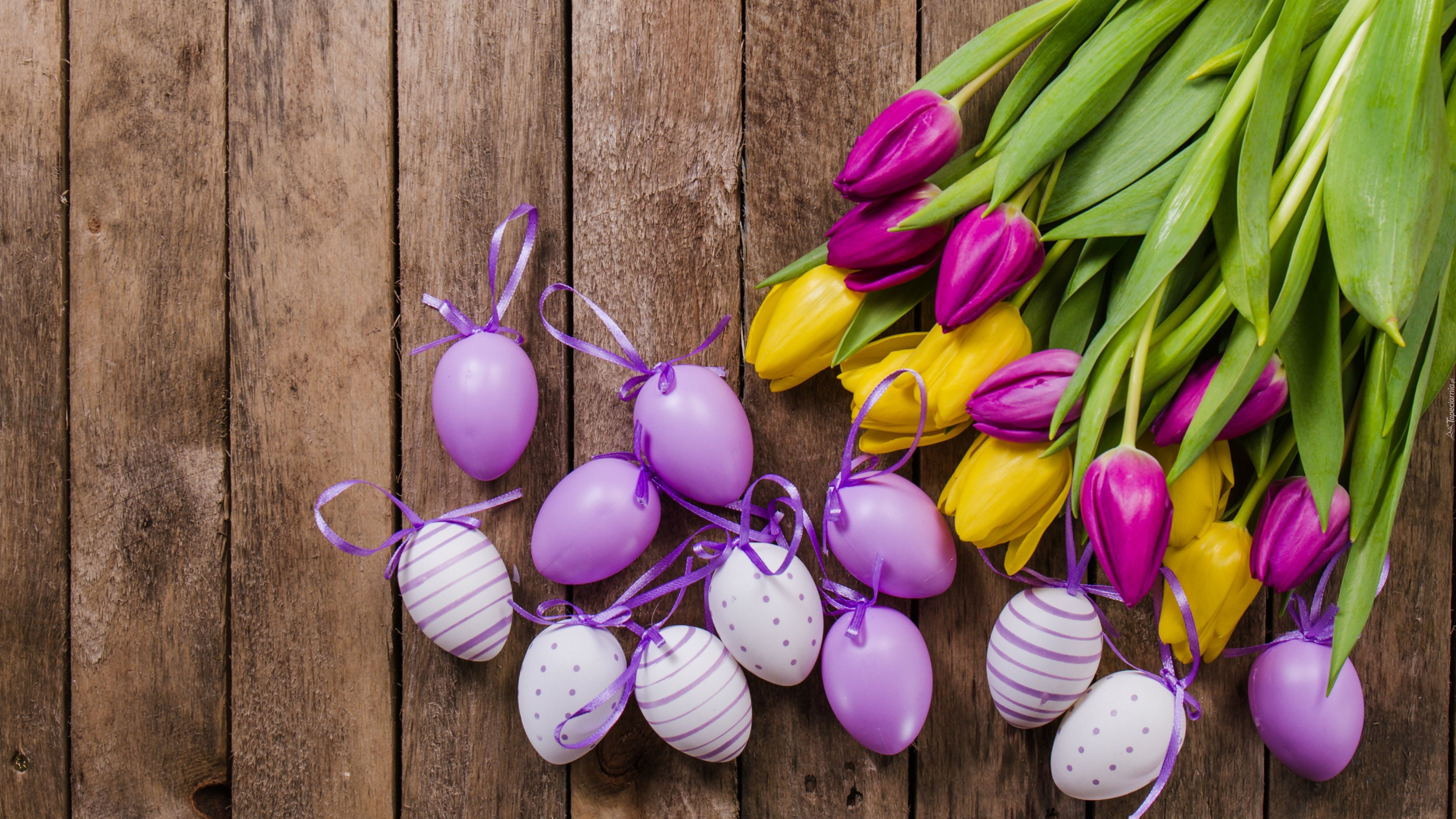 Edytor tapety: Wielkanocne pisanki z kokardkami obok kolorowych tulipanów