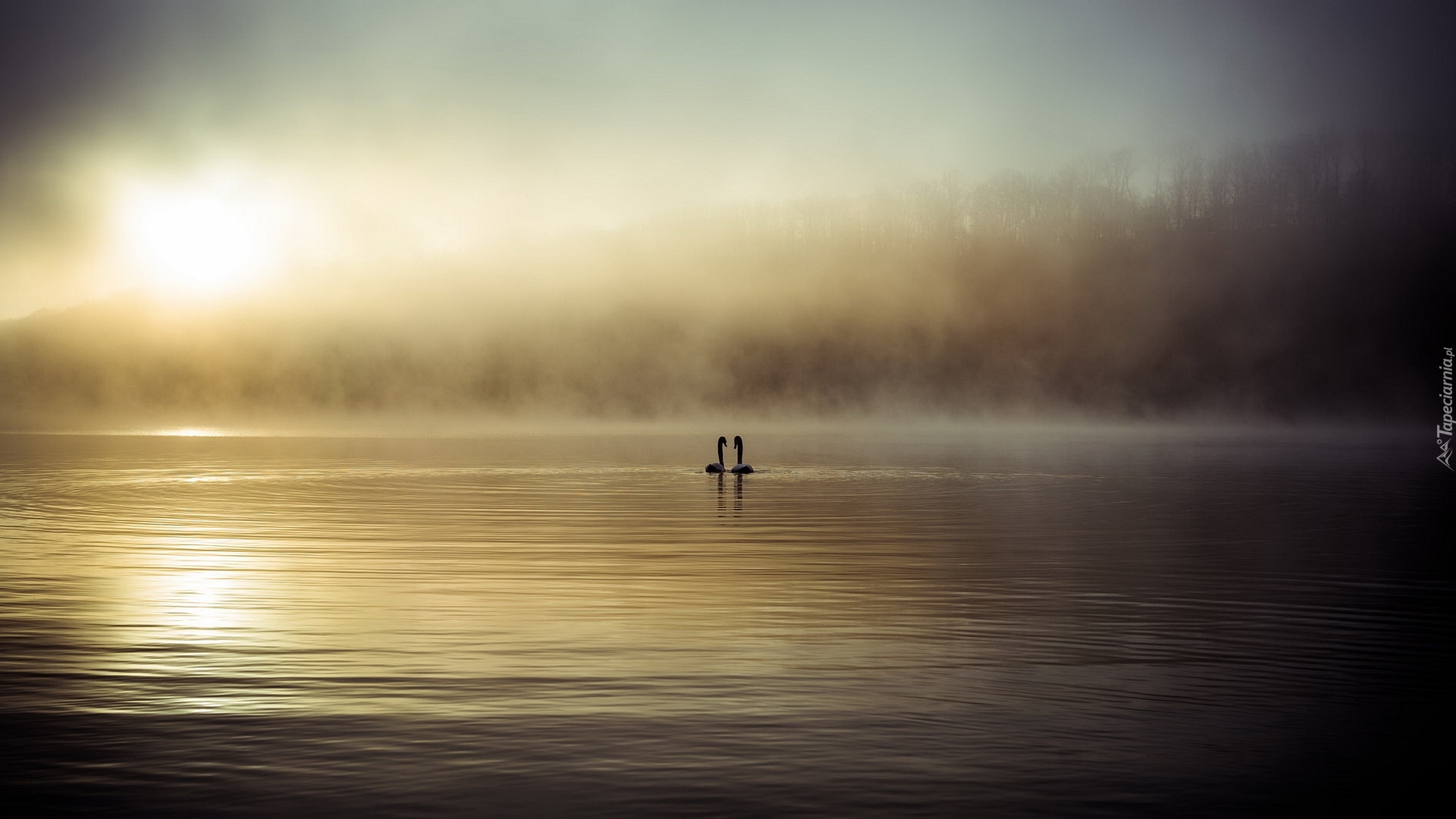 Edytor tapety: Dwa łabędzie na zamglonym jeziorze