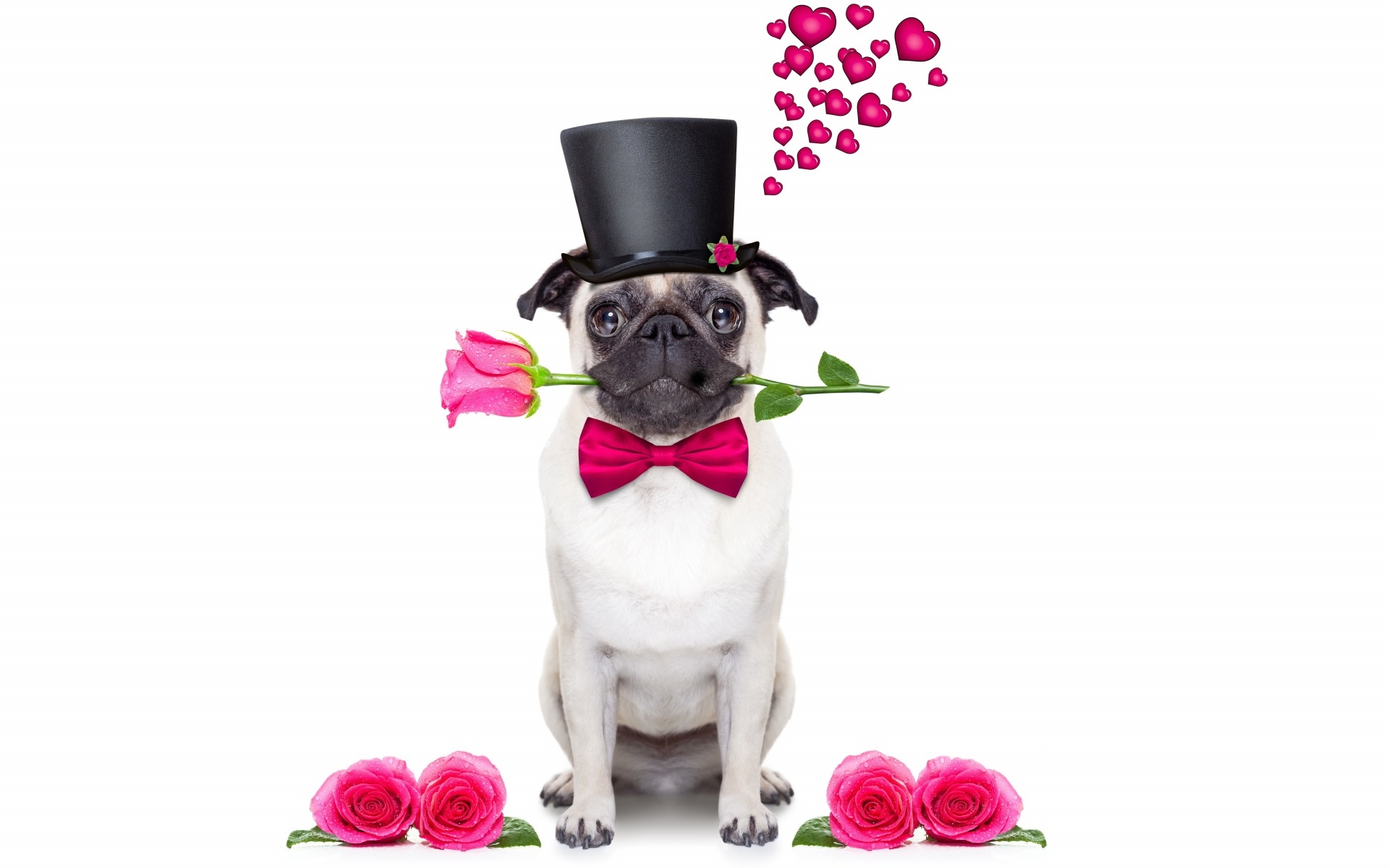 Edytor tapety: Pies romantyk w cylindrze i różą w pyszczku