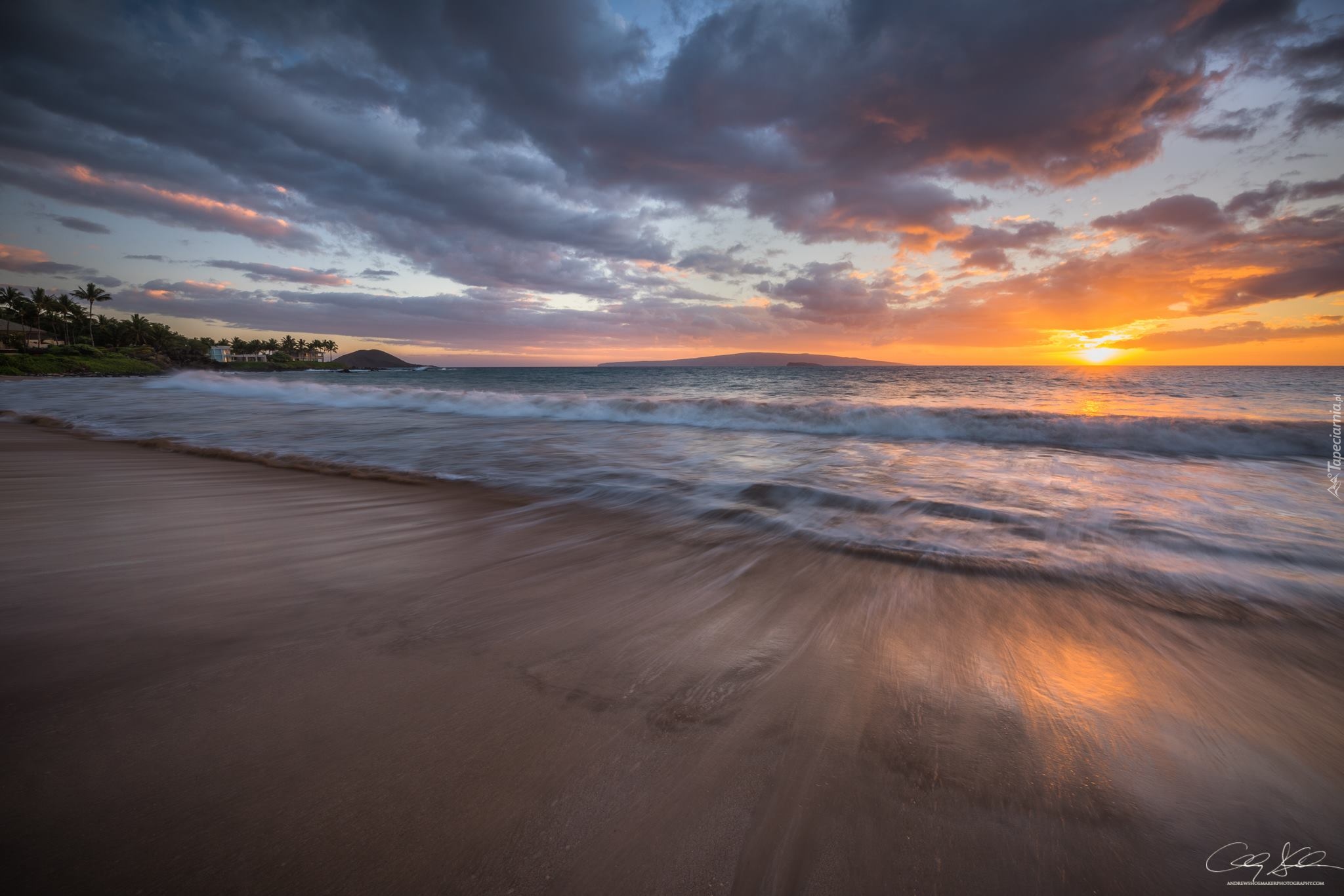 Edytor tapety: Hawajska plaża nad oceanem o zachodzie słońca
