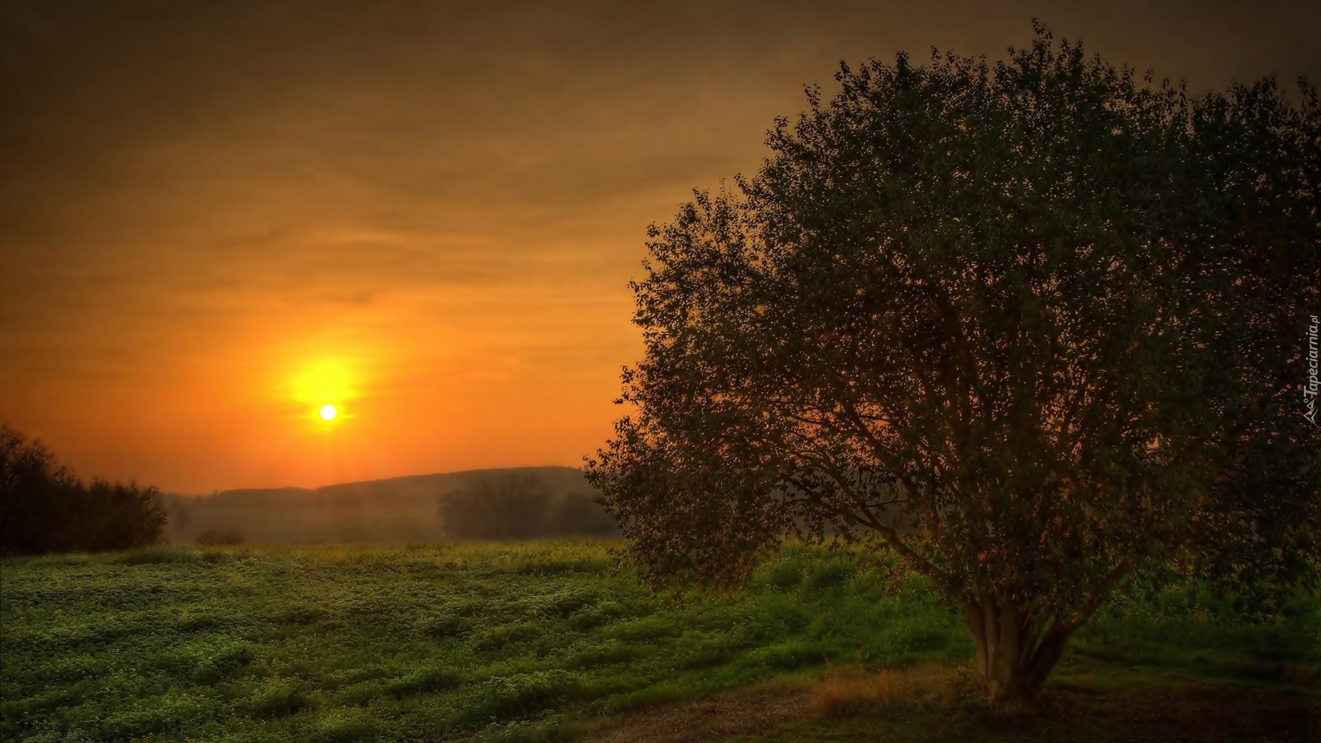 Edytor tapety: Drzewo na zamglonej łące w zachodzącym słońcu