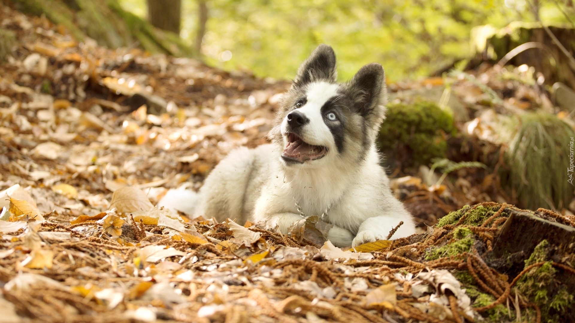 Edytor tapety: Łajka zachodniosyberyjska leży na liściastej polanie