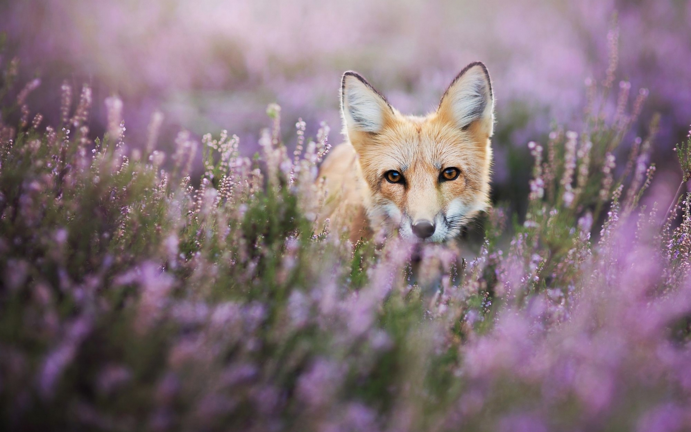 Edytor tapety: Lis przyczajony we wrzosach