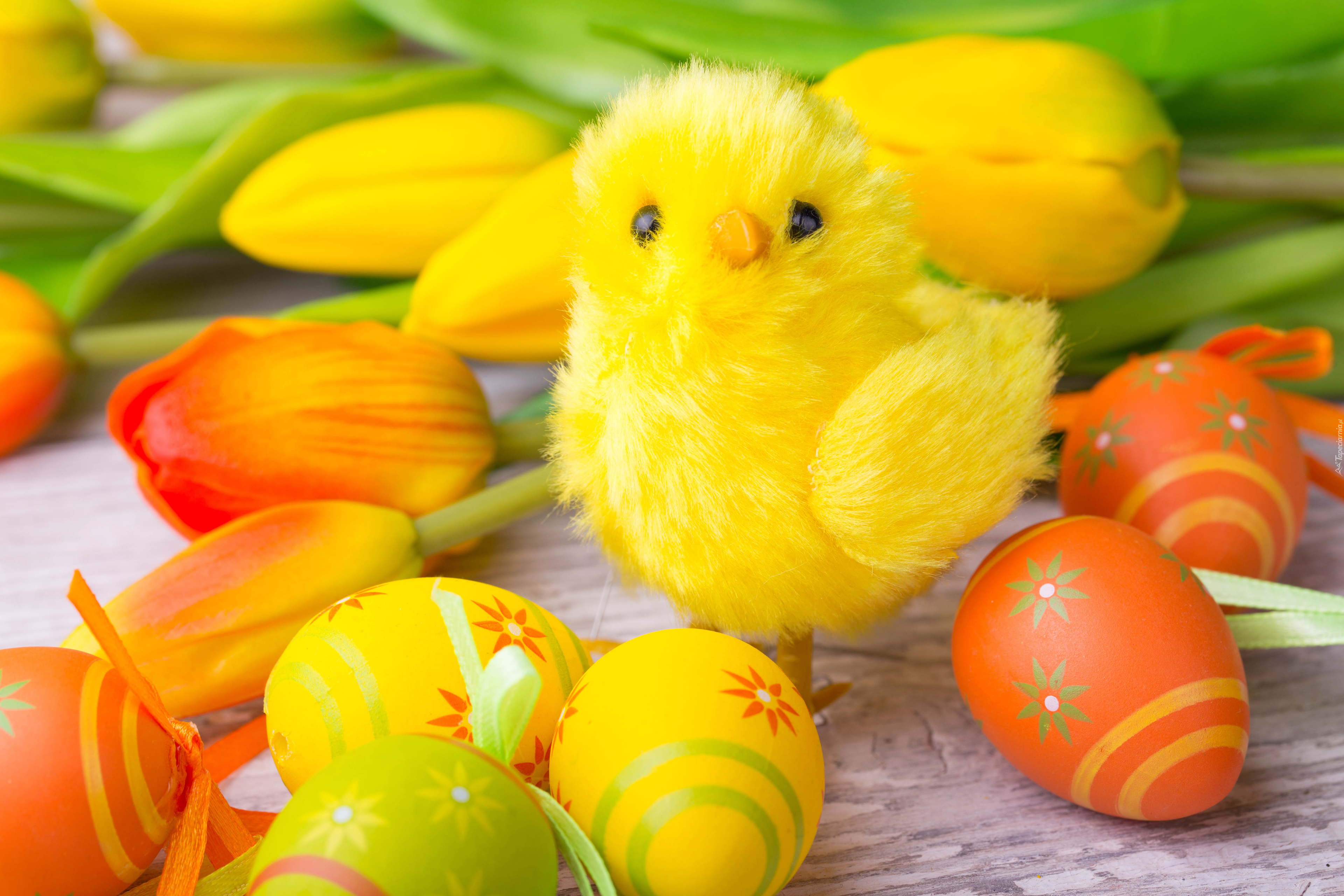 Edytor tapety: Żółty kurczaczek pośród tulipanów i pisanek